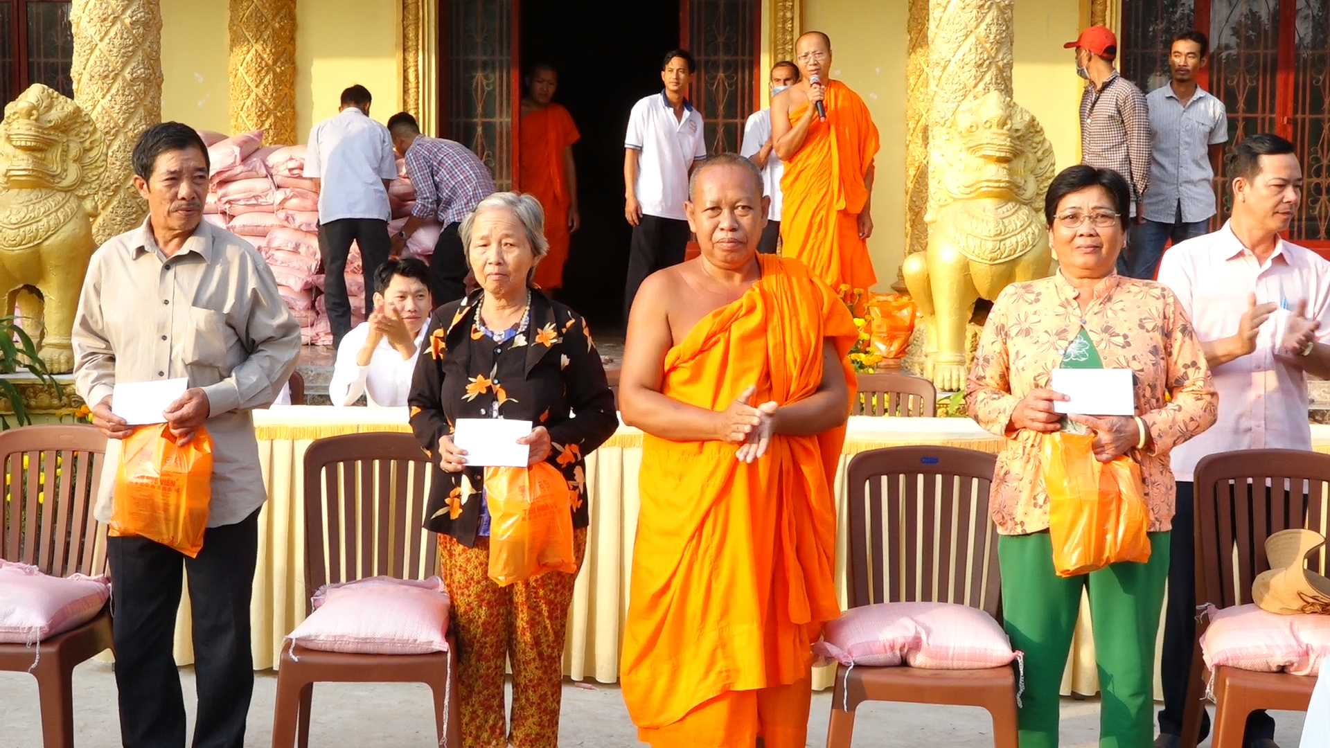 Phát biểu tại buổi lễ, TT. Danh Phản gửi lời tri ân đến quý lãnh đạo chính quyền, các nhà Mạnh thường quân: cô Kim Anh tại Canada, VLXD Hải Sơn,.. quý thiện nam tín nữ xa gần đã chung tay cùng chùa Sóc xoài tổ chức buổi lễ trao quà mang đầy ý nghĩa.