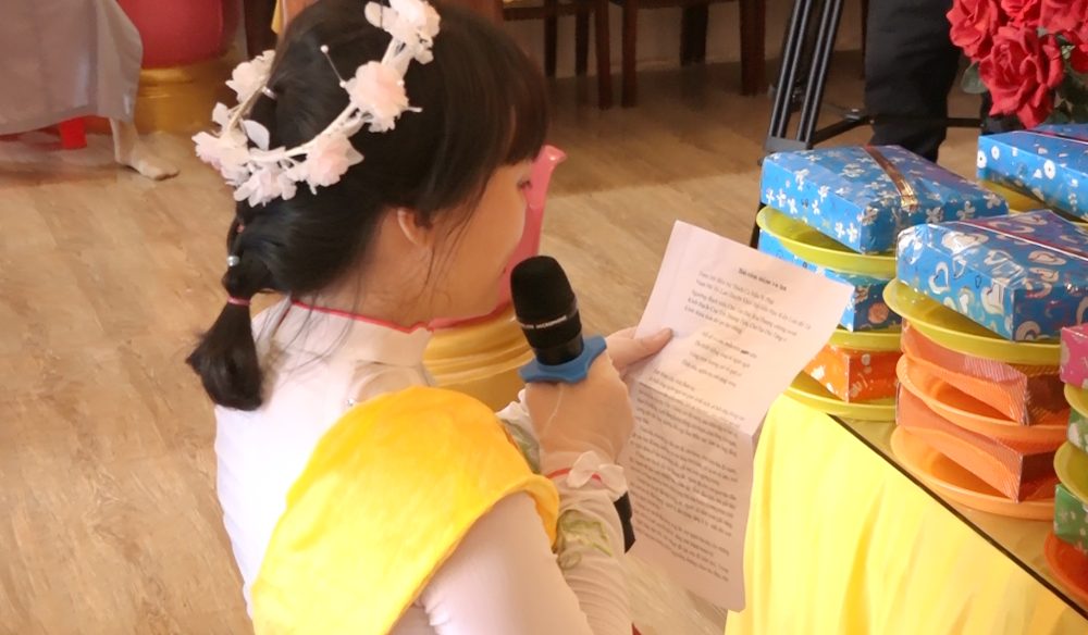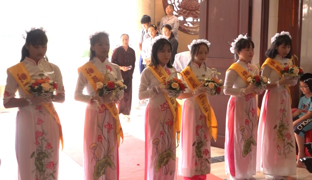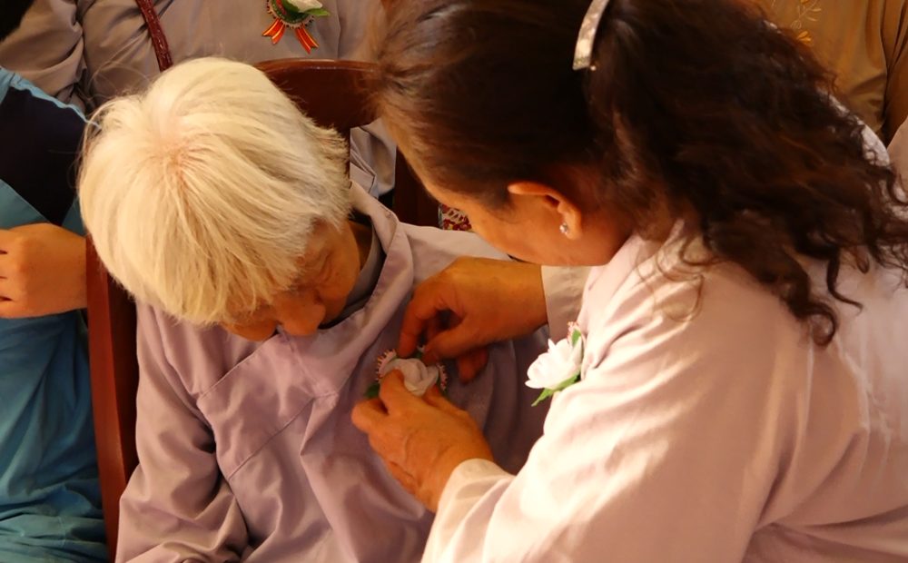 Thay mặt cho hàng Phật tử và đại chúng, Phật tử Ngọc Thúy đã có bài đọc cảm niệm và lời tác bạch đến Chư Tôn đức chứng minh. Nghi thức cài hoa hồng được bắt đầu ngay sau đó, từng bông hoa được các em trong GĐPT chùa Bửu Quang cài lên ngực áo của chư Tôn đức và toàn thể hội chúng. Thật diễm phúc cho ai còn được cài lên ngực áo mình cành hoa màu đỏ và bất hạnh thay cho những ai cài hoa trắng lên ngực áo của mình… vì sẽ không bao giờ còn tìm lại được hơi ấm của cha mẹ.