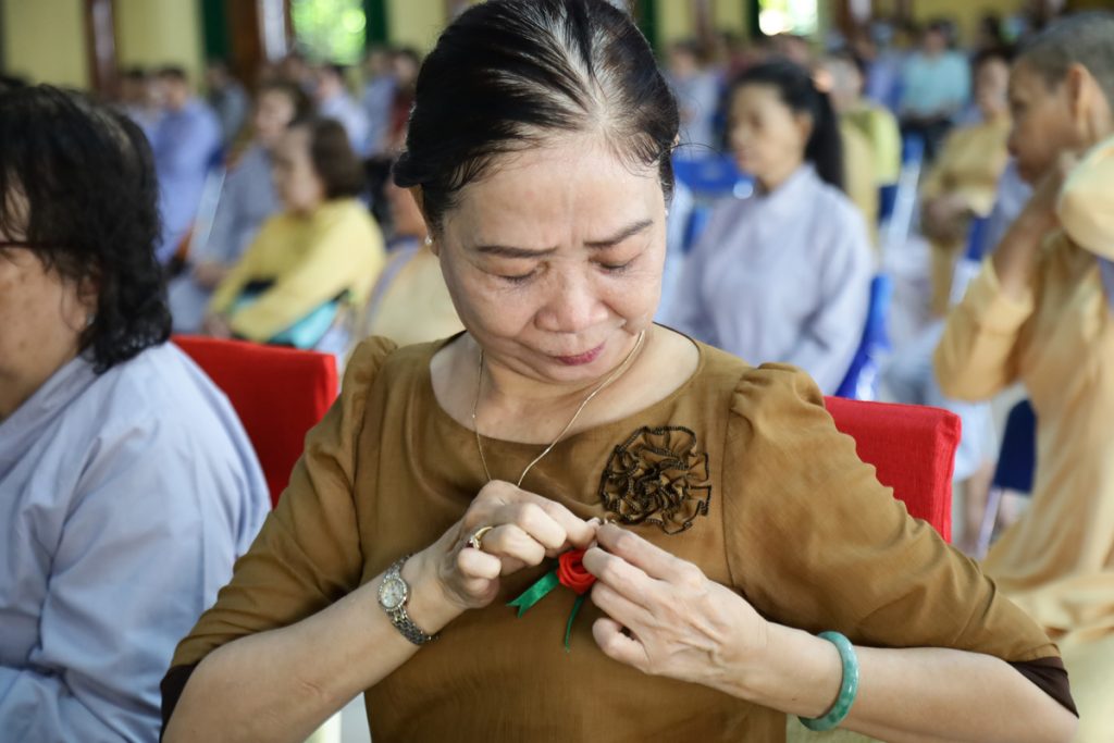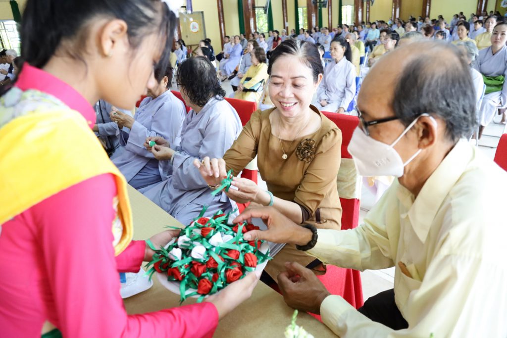 Tại buổi lễ, đại diện Phật tử chùa Phật Quang dâng hoa cúng dường mừng khánh tuế chư Tôn đức thêm một tuổi đạo và đọc cảm niệm mùa Vu Lan trong niềm tri ân sâu sắc. Sau đó cài lên ngực áo chư Tôn đức và Phật tử tham dự lễ những bông hồng đỏ cho những ai còn mẹ và bông hồng trắng cho những ai không còn mẹ trên đời.