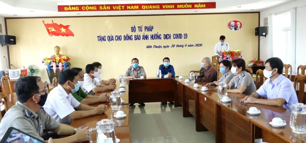 Tại buổi lễ, ĐĐ. Thích Pháp Trí đại diện BTS GHPGVN tỉnh Kiên Giang trao bảng tượng trưng 5 tấn gạo cho lãnh đạo huyện Vĩnh Thuận. Đại diện Bộ Tư pháp, ông Nguyễn Văn Vũ, Cục trưởng Cục thi hành án tỉnh Kiên Giang trao số tiền 50 triệu đồng.