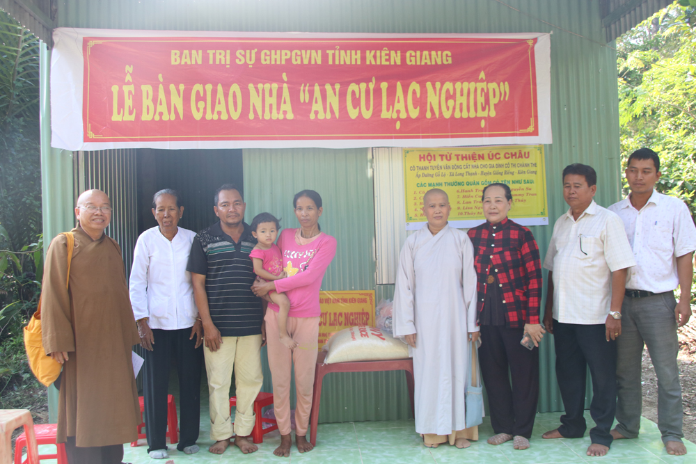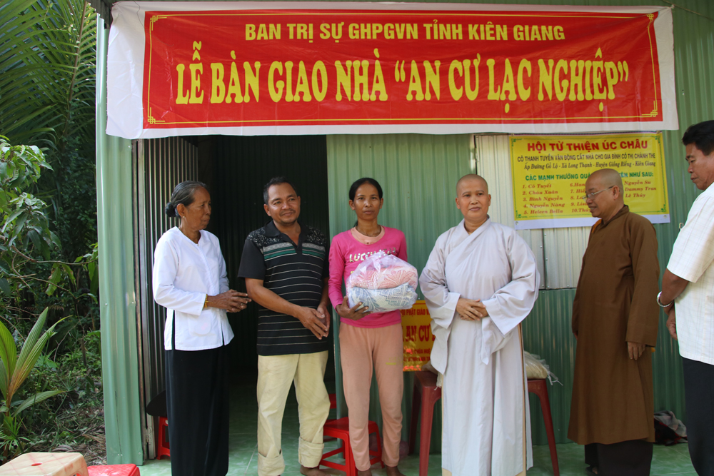 Trước khi bàn giao căn nhà cho hộ gia đình Thị Chành The, ĐĐ.Thích Tuệ Giải đãi lao chư Tôn đức trong Ban Thường trực BTS GHPGVN tỉnh Kiên Giang có đôi lời phát biểu, chúc mừng đến gia đình chị The có được căn nhà mới đồng thời cũng gửi lời cảm ơn đến chính quyền địa phương và SC.Thích Nữ Tâm Ngộ đã vận động nhà hảo tâm, mạnh thường quân cùng chung tay giúp đỡ những người có hoàn cảnh khó khăn có được mái ấm để yên tâm lập nghiệp và đặc biệt hơn là để góp phần cùng chính quyền địa phương xây dựng nông thôn mới.