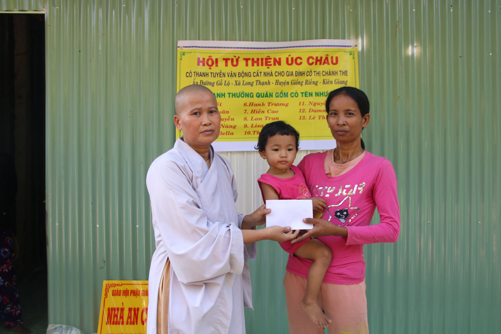 Được biết, căn nhà được xây dựng nền bê tông cốt thép do SC.Thích Nữ Tâm Ngộ vận động mạnh thường quân từ Úc châu và Phật tử gần xa cùng đóng góp. Bên cạnh đó đoàn còn trao tặng một cây nước, một chiếc giường ngủ, mùng, mền và một bao gạo với tổng giá trị hơn 35 triệu đồng.