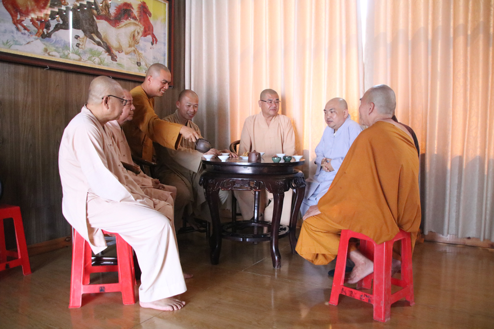 Bên cạnh những thời khóa tu tập nghiêm trì, chư Tôn đức ngồi thảnh thơi an lạc, quây quần bên tách trà, chia sẻ đôi câu chuyện đạo, lời kinh ý tổ thấm nhuần qua từng thanh âm êm dịu. Như gửi gắm cho nhau trong cái vô ngã vị tha, chơn thường bất diệt của đời sống Tăng đoàn hòa hợp. Đặc biệt, là bàn thiền trà luôn được chư tôn đức Trụ trì chia sẻ về nội dung củng cố tăng đoàn, nâng cao đời sống tâm linh và lý tưởng người tu sĩ tận tâm cống hiến cho Giáo hội – hết lòng phục vụ cho xã hội và chúng sanh.