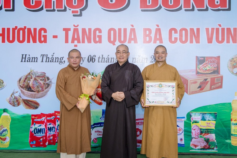 Sau khai phát biểu khai mạc, HT. Thích Minh Nhật đã đại diện Thường trực Ban Trị sự GHPGVN tỉnh đã tặng bằng tán dương đến TT. Thích Quảng Cao, TT. Thích Chiếu Ý ghi nhận sự đoàn kết, nổ lực của toàn Ban trong công tác an sinh xã hội.