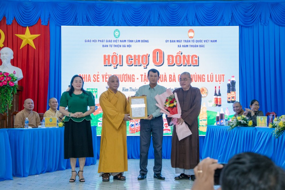 Phát biểu cảm ơn, ông Nguyễn Ngọc Tuấn Anh chia sẻ rằng: “Do mưa bão kéo dài, cộng với việc các hồ chứa ở thượng nguồn xả lũ, dẫn đến khu phố Kim Bình, Kim Ngọc, Ung Chiếm và một phần khu phố Thắng Lợi thuộc phường Hàm Thắng bị ngập sâu gây thiệt hại nặng nề cho bà con tại địa phương. Trong lúc cấp thiết, Ban Từ thiện xã hội Phật giáo tỉnh và các đạo tràng tại địa phương đã luôn đồng hành cùng chính quyền thực hiện công tác cứu trợ cứu nạn, an sinh xã hội khắc phục hậu quả thiên tai. Qua đây, ông đã tặng hoa và thư cảm ơn đến Ban tổ chức chương trình “Phiên chợ 0 đồng”.