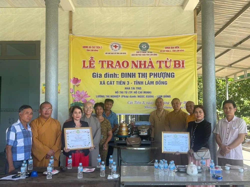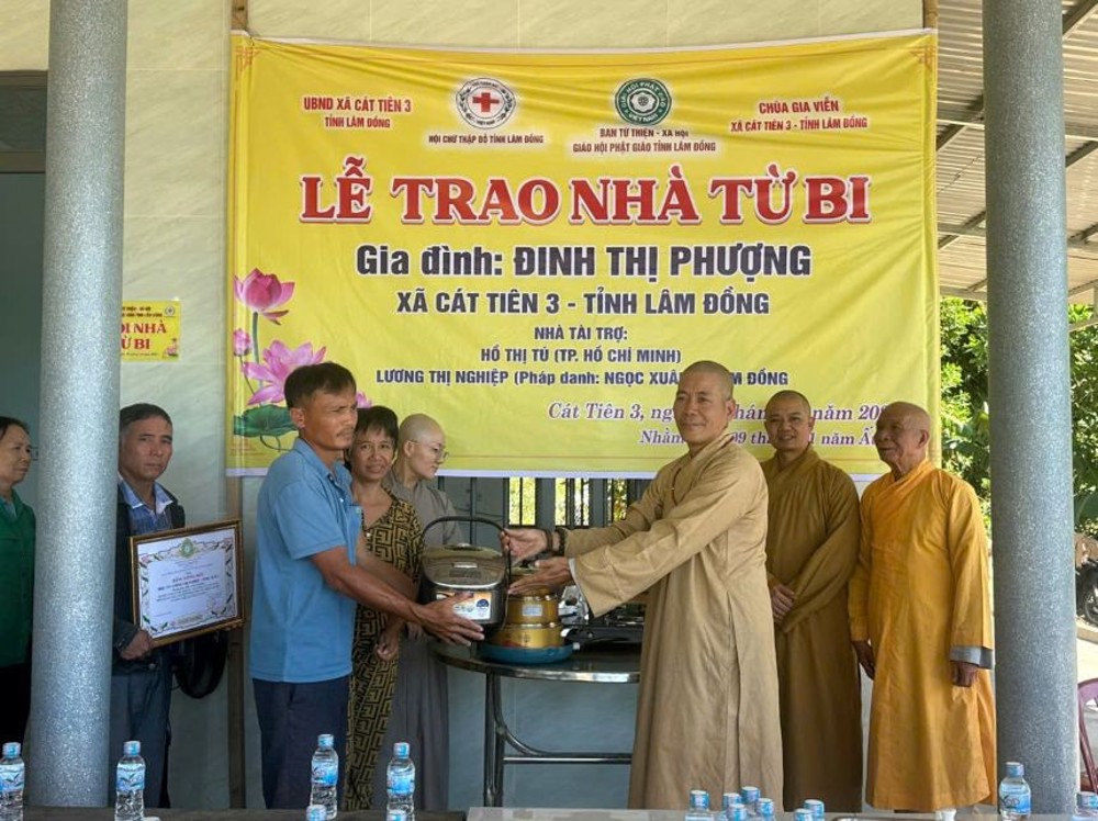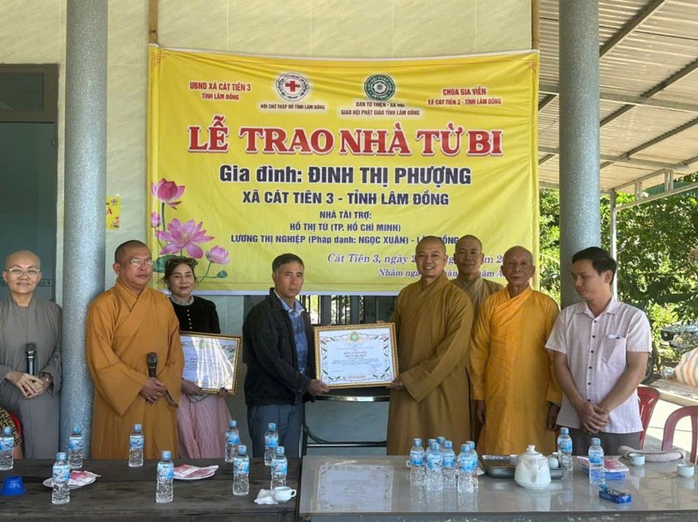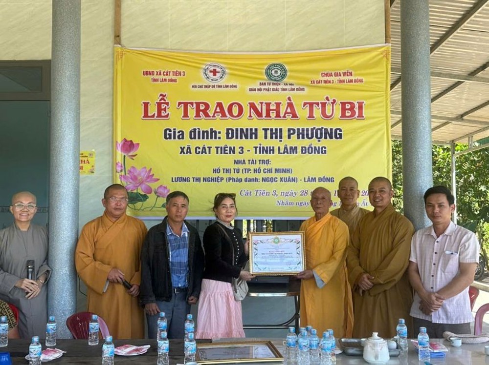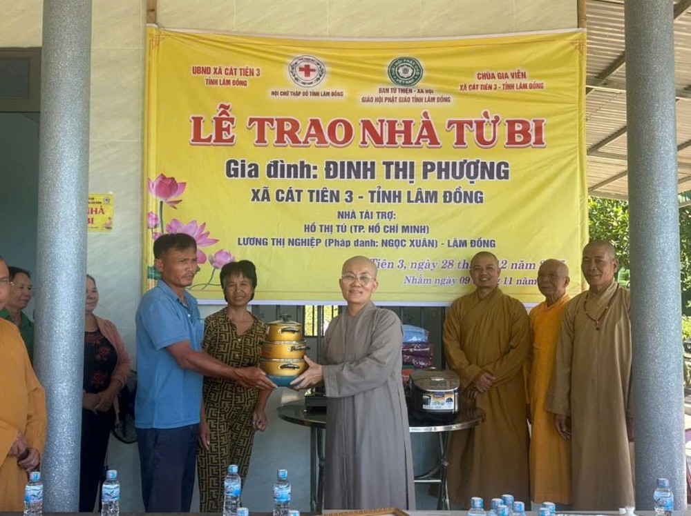 Sáng ngày 28/12/2025, chư Tôn đức Ban Từ thiện xã hội Phật giáo tỉnh Lâm Đồng phối hợp với Hội Chữ thập đỏ tỉnh Lâm Đồng và UBND xã Cát Tiên 3 tổ chức lễ bàn giao nhà Từ bi, trao quà cho hộ gia đình bà Đinh Thị Phượng tại xã Cát Tiên 3, cách trung tâm tỉnh Lâm Đồng khoảng 250 km, với tổng kinh phí hơn 150 triệu đồng.