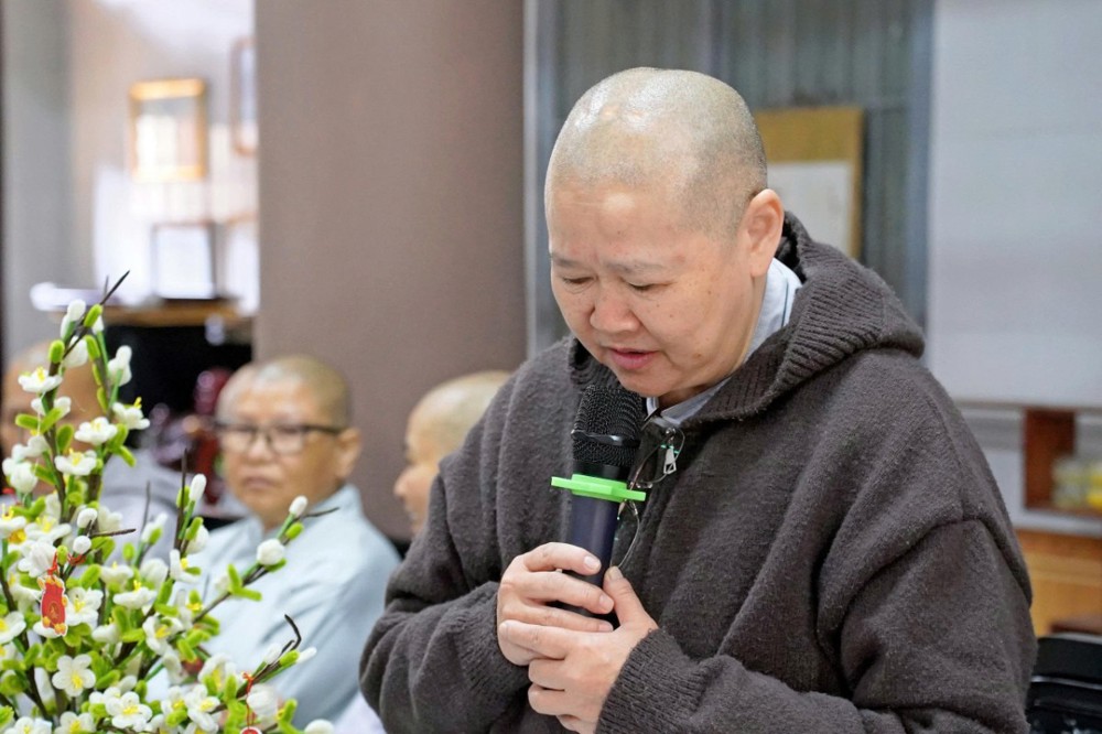 Thay mặt Ban Thư ký, NS. Thích Nữ Hạnh Nhẫn – Chánh Thư ký PBNG GHPGVN tỉnh Lâm Đồng đã gửi lời tri ân đến Thượng tọa chứng minh cùng chư Tôn đức Ni trưởng, Ni sư đã quang lâm chứng minh và tham dự phiên họp, góp phần định hướng và hoàn thiện công tác tổ chức Đại lễ.