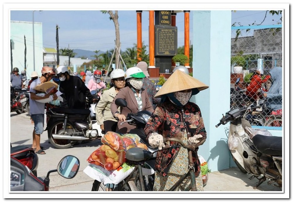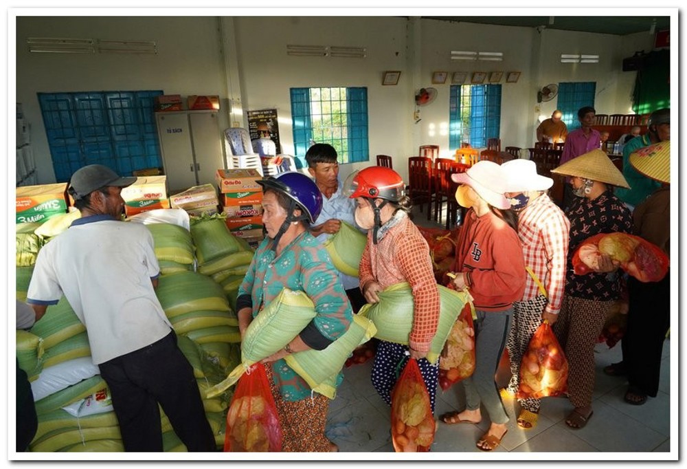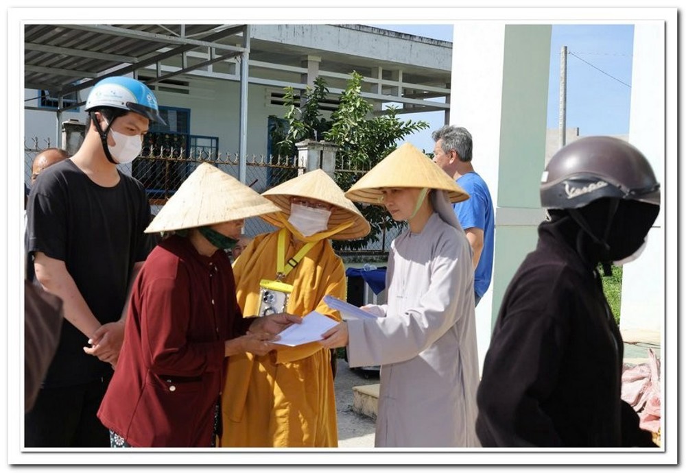 Tại xã Hàm Thuận chư tôn đức đã thăm hỏi và trao tặng 550 suất quà tới các gia đình có hoàn cảnh khó khăn sau cơn bão lũ tại 2 điểm thôn Tầm Hưng và thôn Dốc Lăng.
