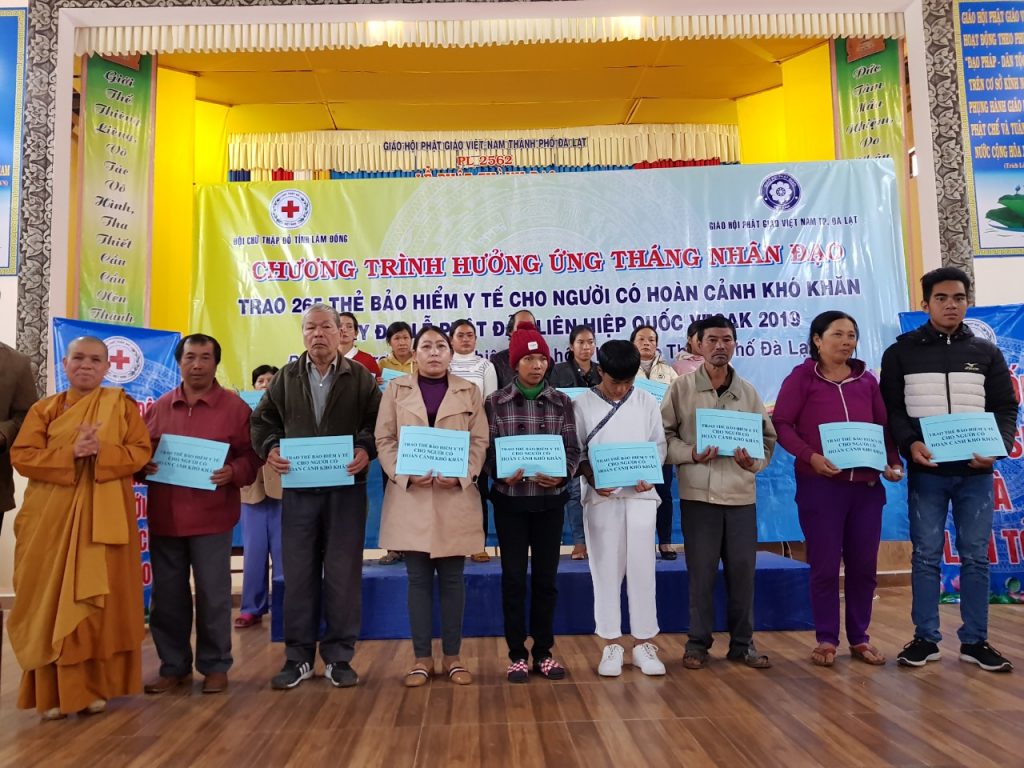 Trên tinh thần cứu khổ độ sanh có rất nhiều pháp môn, nhiều phương tiện để xuyên qua trái tim nhiệt huyết, đam mê và sự quan tâm sâu sắc đến mọi người một cách thiết thực nhất, bởi lẽ cho người vật chất có ngày sẽ hết, cho người công danh ở giới hạn, nhưng cho người sức khỏe sẽ có tất cả, một bầu trời tươi sáng, một không gian rộng, một niềm tin hy vọng, với bao ước muốn có thể đem đến vật chất lẫn tinh thần. Nhận thấy việc làm vô cùng ý nghĩa đó, sáng ngày 5/5/2019 Ban Từ thiện Thành phố Đà Lạt đã trao 265 thẻ Bảo hiểm y tế, sức khỏe vì cộng đồng cho những người có hoàn cảnh khó khăn Thành phố trên địa bàn.
