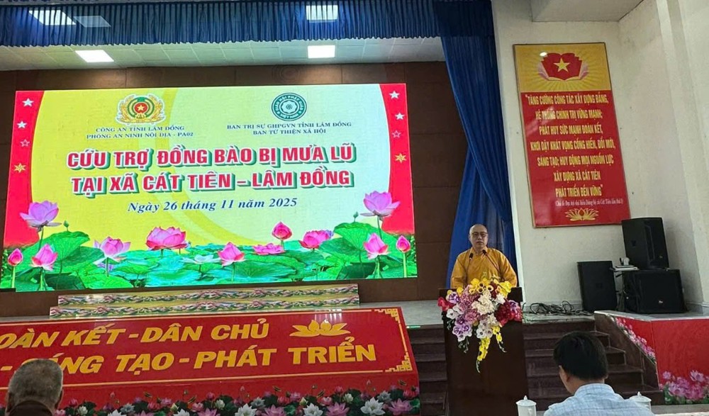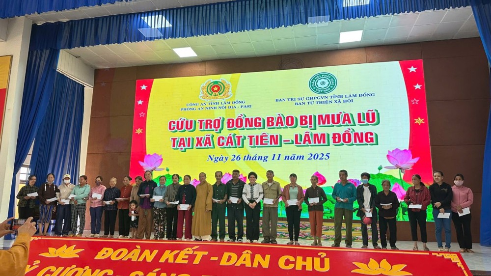 Ngày 26/11/2025, tại xã Cát Tiên, đoàn cứu trợ có sự chứng minh và tham dự của TT. Thích Thanh Nhật – Phó Ban kiêm Chánh Thư ký Ban Trị sự Phật giáo tỉnh, TT. Thích Chiếu Ý – Phó Ban Trị sự kiêm Phó Thường trực Ban TTXH Phật giáo tỉnhNi sư Thích Nữ Hạnh Khai, UVTT BTS PG tỉnh, Phó Thường trực Ban TTXH Phật giáo tỉnh, Phó Thư ký PBNG tỉnh, chư Tôn đức cùng quý cư sĩ thành viên ban TTXH PG; Thượng tá Lê Công Duy - Phó trưởng phòng PA02 cùng các cán bộ của phòng.
