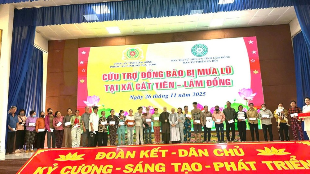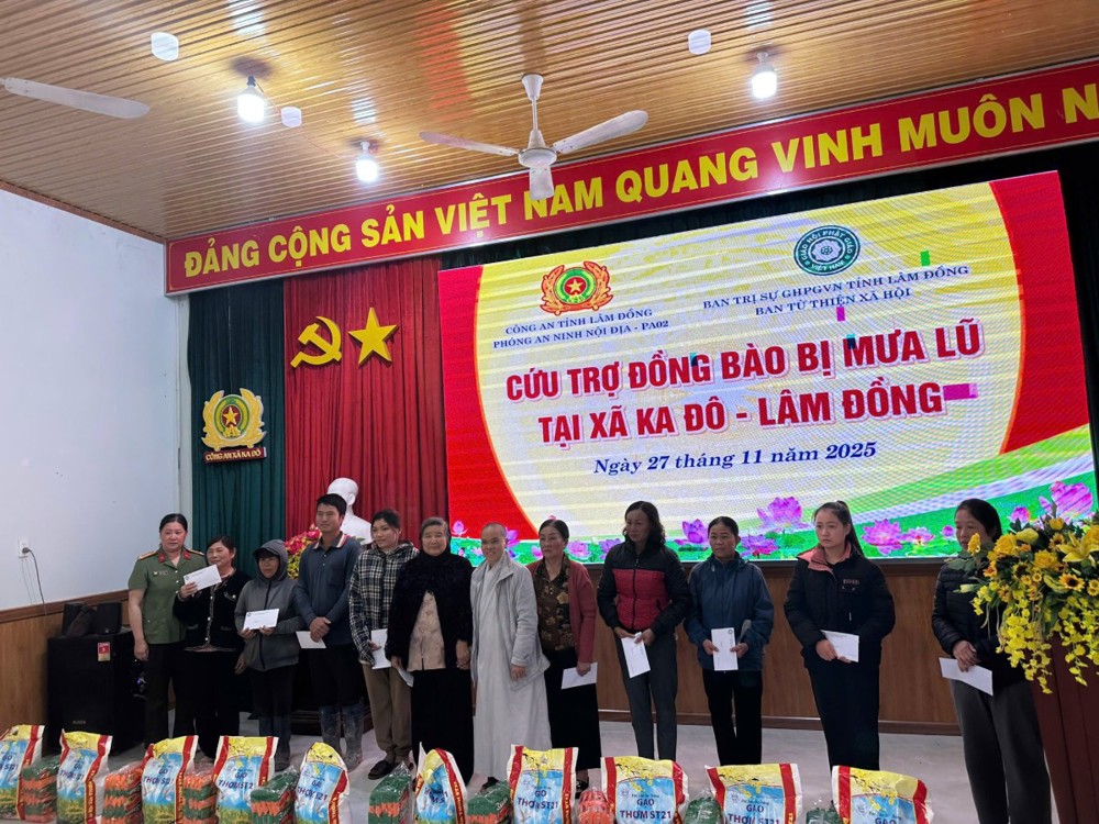 Trong hai ngày 26 và 27/11/2025, thực hiện chỉ đạo của Ban Trị sự GHPGVN tỉnh Lâm Đồng, Ban Từ thiện Xã hội Phật giáo tỉnh, kết hợp cùng phòng An ninh Nội địa công an tỉnh, đến thăm và trao 650 phần quà đến đồng bào 3 xã Cát Tiên, Đa Kô và D’Ran, cùng hỗ trợ khẩn cấp một số hoàn cảnh đặc biệt với tổng kinh phí 625 triệu đồng.