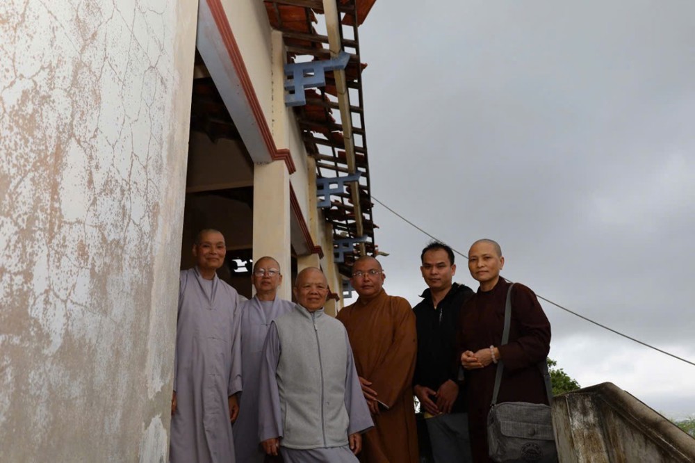 Buổi trưa ngày 16, đoàn đến chùa Linh Tiên, một trong những ngôi chùa chịu thiệt hại nặng nề nhất của bão số 13. Mái chùa bị tốc, tường vách sập đổ, cảnh vật tang thương khiến ai cũng không khỏi chạnh lòng. Với tấm lòng hướng về Tam Bảo và bà con, đoàn đã trao 102 phần quà trị giá 1,1 triệu đồng để hỗ trợ chùa và người dân ổn định lại cuộc sống.