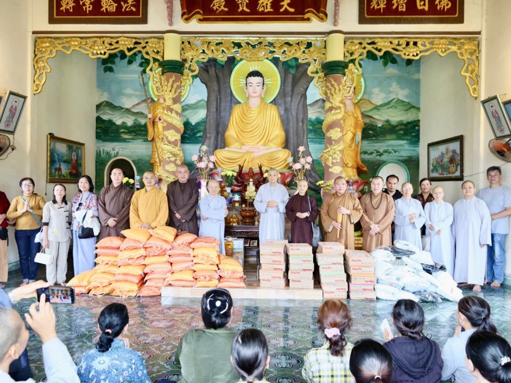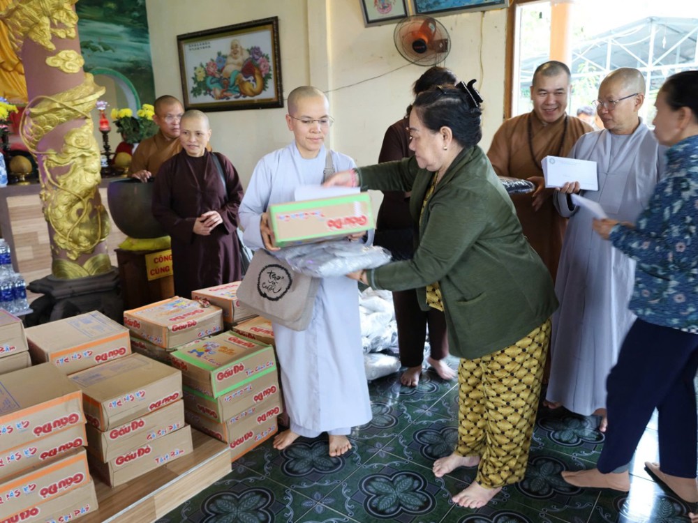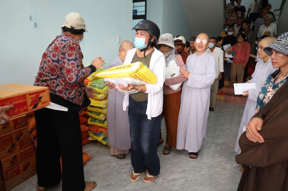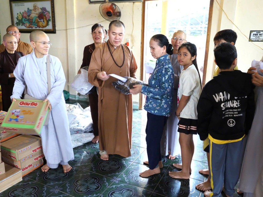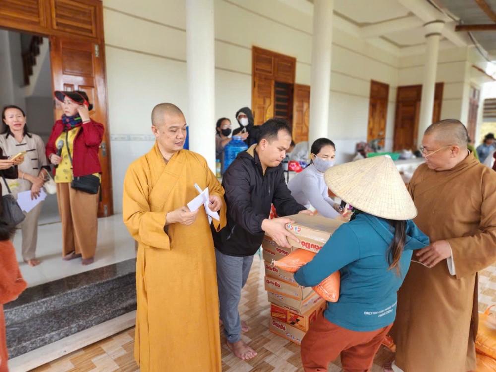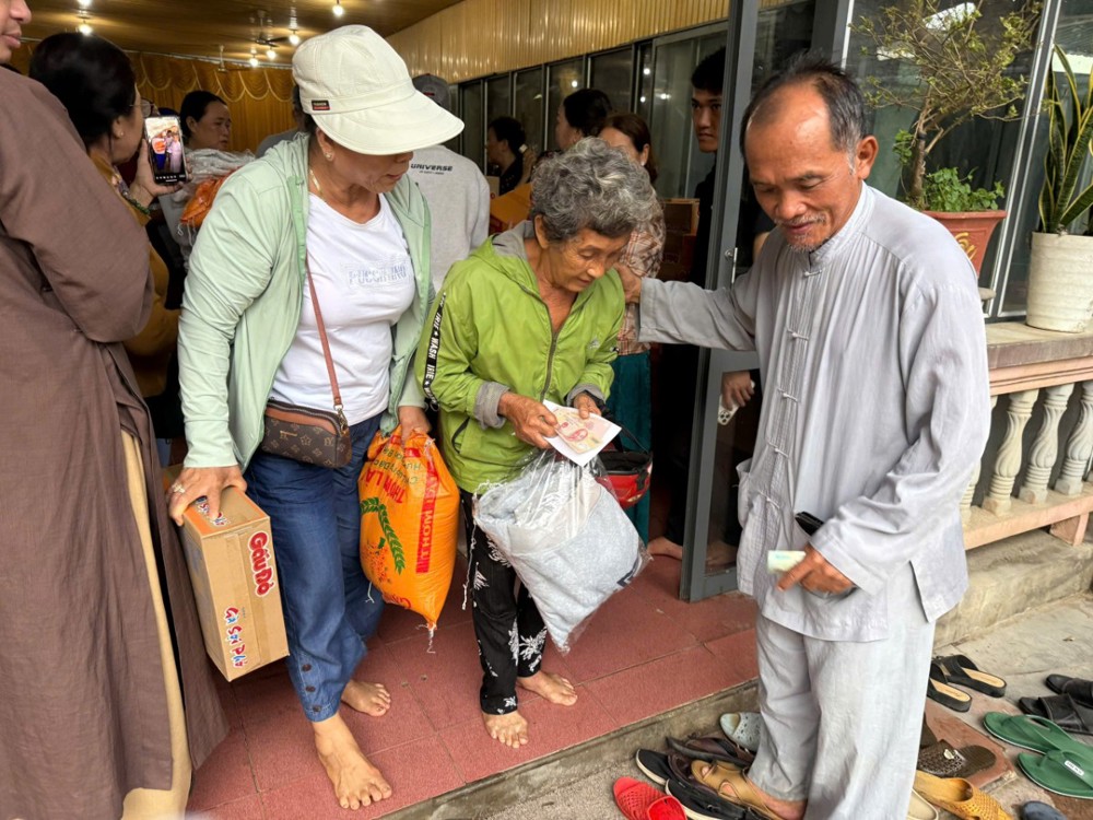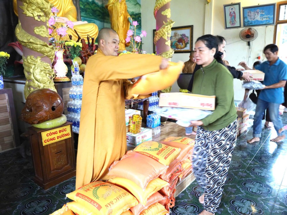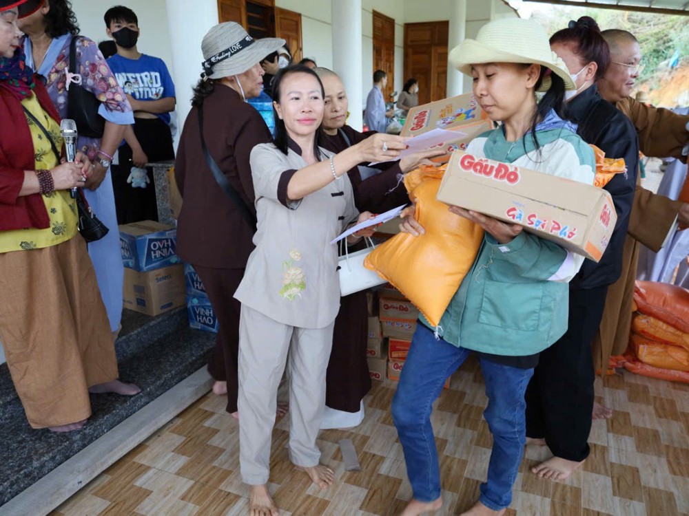 Tiếp đến, đoàn có mặt tại chùa Hưng Long, nơi chịu nhiều ảnh hưởng bởi thiên tai. Trong không khí ấm áp nghĩa tình, đoàn đã trao 208 phần quà, mỗi phần trị giá 1,4 triệu đồng, bao gồm gạo, mì, nhu yếu phẩm và tiền mặt.