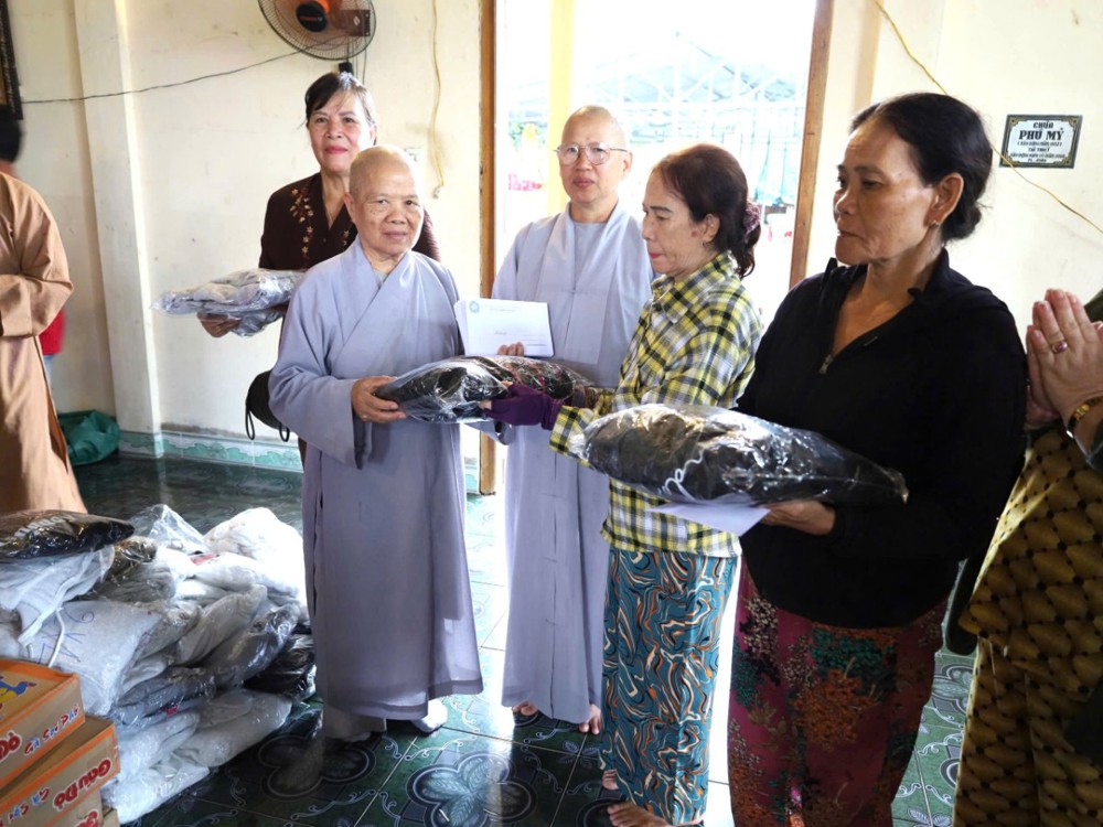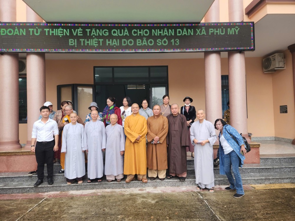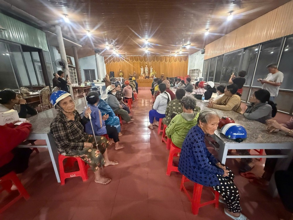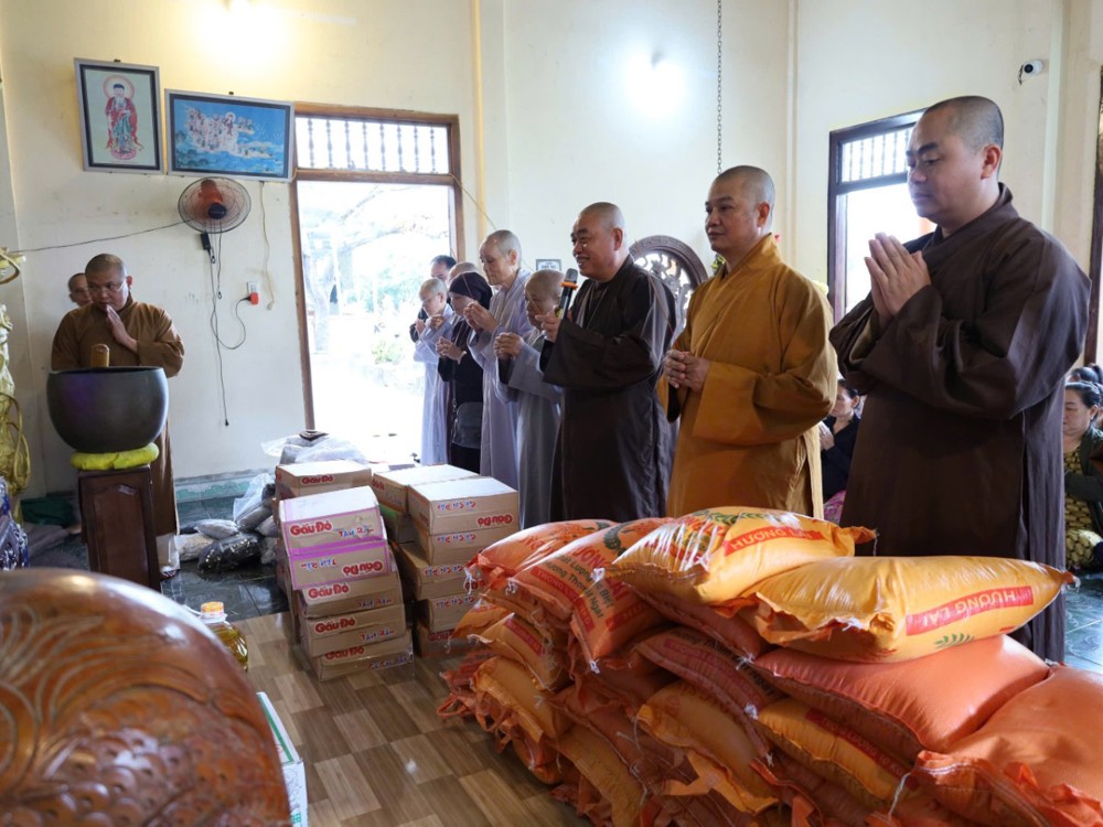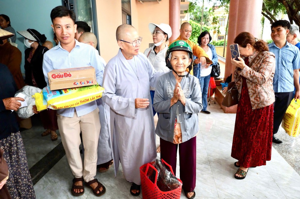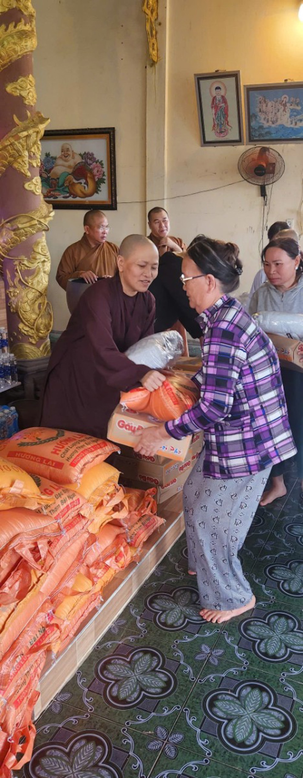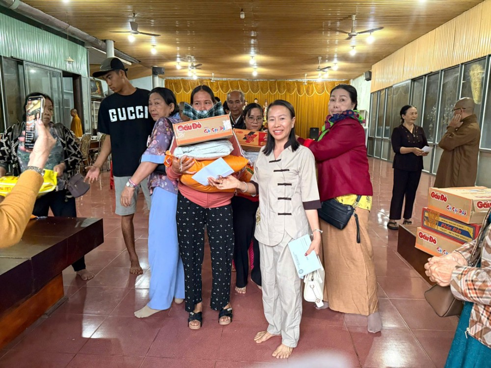 Tiếp đến, đoàn có mặt tại chùa Hưng Long, nơi chịu nhiều ảnh hưởng bởi thiên tai. Trong không khí ấm áp nghĩa tình, đoàn đã trao 208 phần quà, mỗi phần trị giá 1,4 triệu đồng, bao gồm gạo, mì, nhu yếu phẩm và tiền mặt.