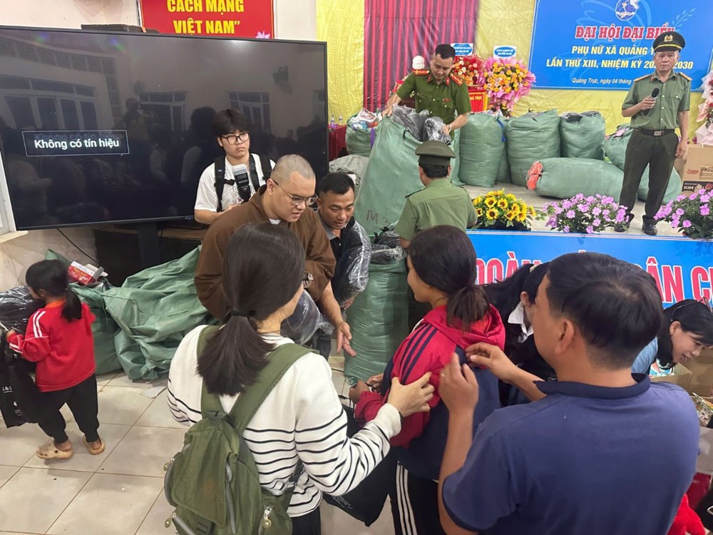 Tại UBND xã Quảng Trực, chương trình trao tặng 500 phần quà cùng 2 tấn gạo. Đồng thời, đoàn kết nối với nhóm thiện nguyện từ TP. Hồ Chí Minh để tặng thêm 500 chiếc mền, 500 hộp sữa, 500 lồng đèn và 200 bộ quần áo học sinh cho các em nhỏ nơi đây.