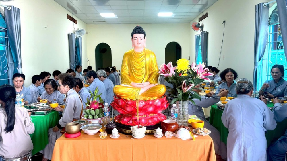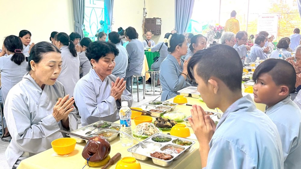 Sau thời Pháp thoại, đại chúng cùng cúng Ngọ, dùng cơm trong chánh niệm và niệm Phật.