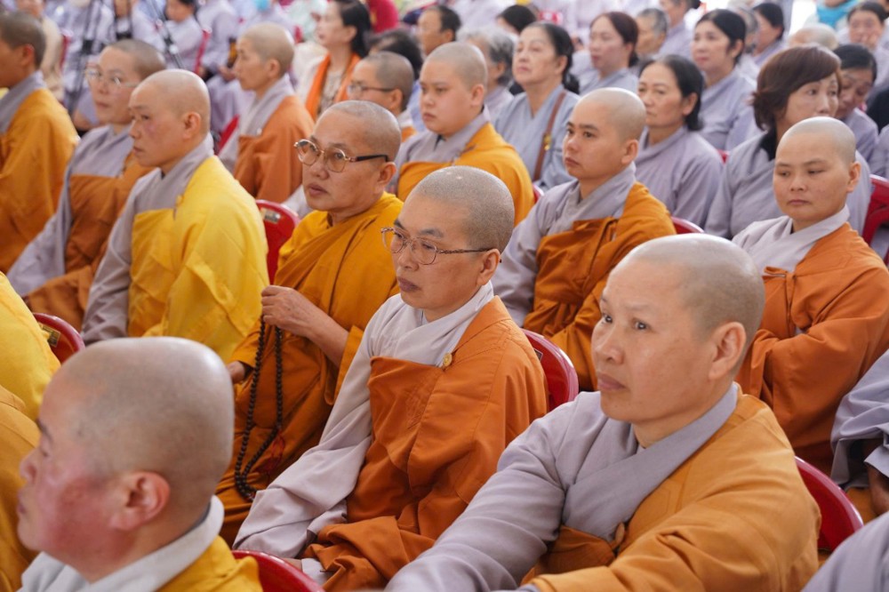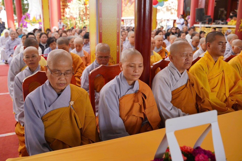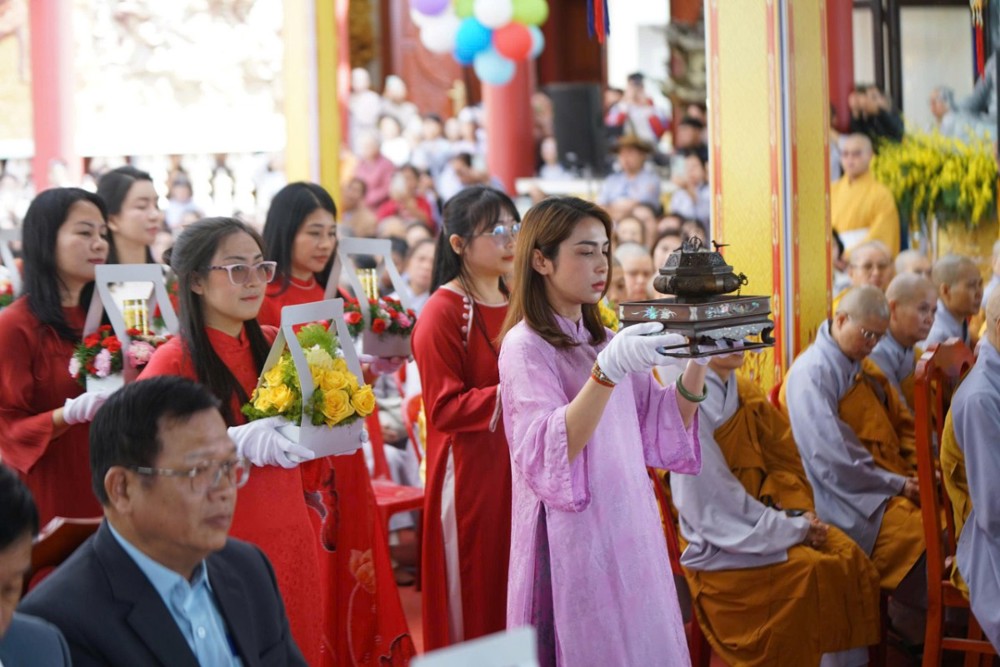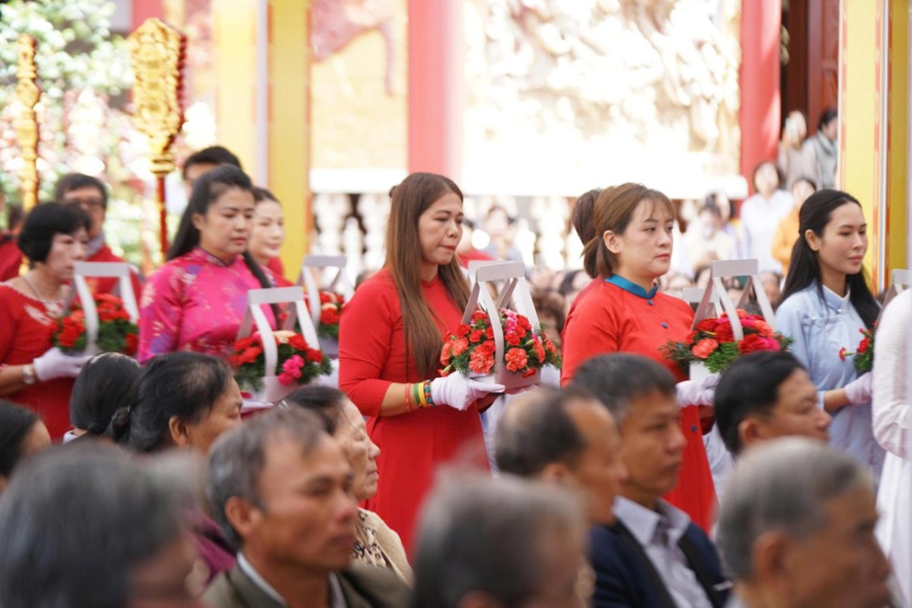 Buổi lễ mở đầu bằng nghi thức dâng hoa lên chư Tôn đức chứng minh trong không khí trang nghiêm và thành kính. Những đóa hoa tươi thắm được dâng lên thể hiện tấm lòng tri ân sâu sắc của đại chúng đối với chư Tôn đức Tăng Ni, những bậc mô phạm đã luôn dìu dắt, chỉ dạy và hộ trì Tam bảo.