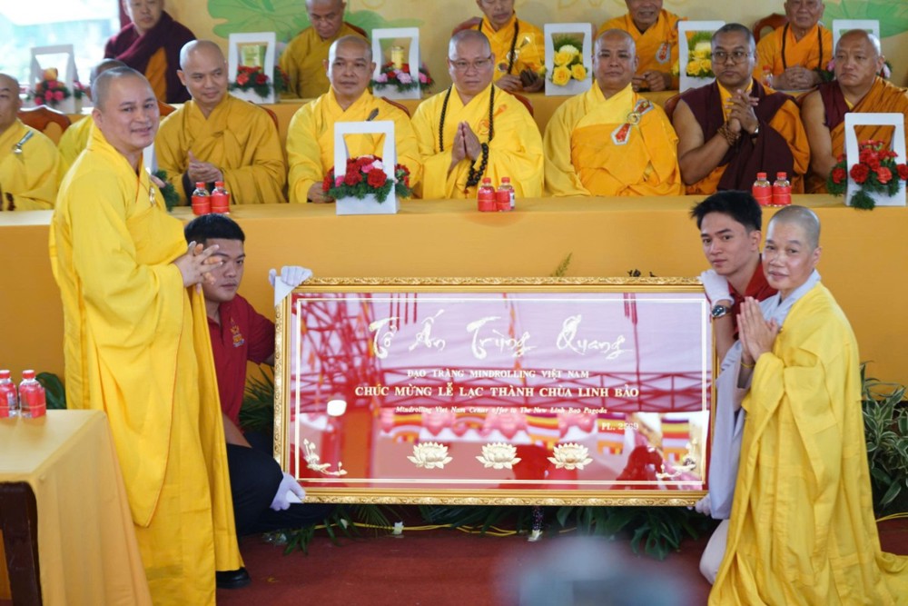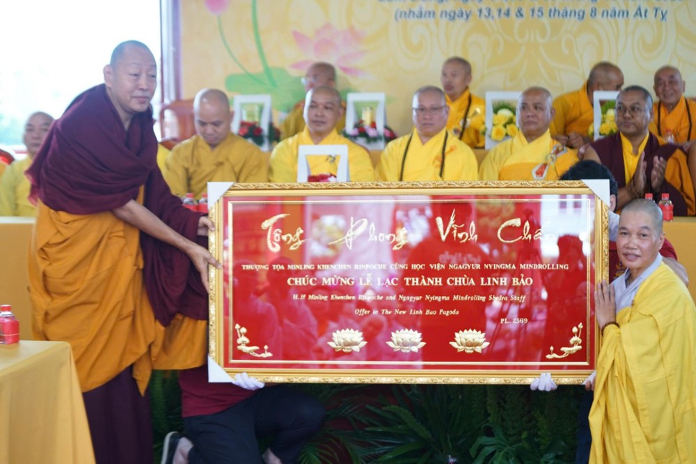 Sau đó, Ngài Minling Khenchen Rinpoche đã ban huấn từ đến Ni sư Thích Nữ Tịnh Trang cùng toàn thể đại chúng. Trong lời huấn từ, Ngài tán thán tâm nguyện kiên định và công hạnh hoằng dương Phật pháp của Ni sư trong suốt quá trình kiến tạo, trùng tu và phát triển chùa Linh Bảo. Đồng thời, Việc hoàn thành Đại hùng Bảo điện không chỉ là thành tựu về mặt vật chất, mà còn là biểu hiện của tín tâm, trí tuệ và lòng từ bi - những giá trị cốt lõi mà người tu hành cần nuôi dưỡng để mang lại lợi ích cho chúng sanh.