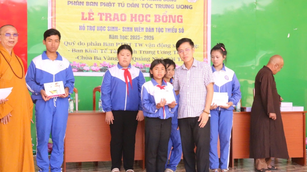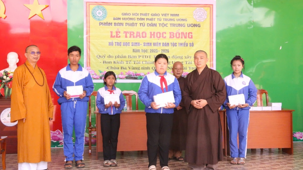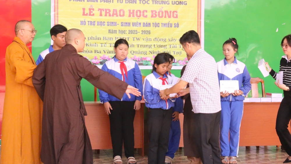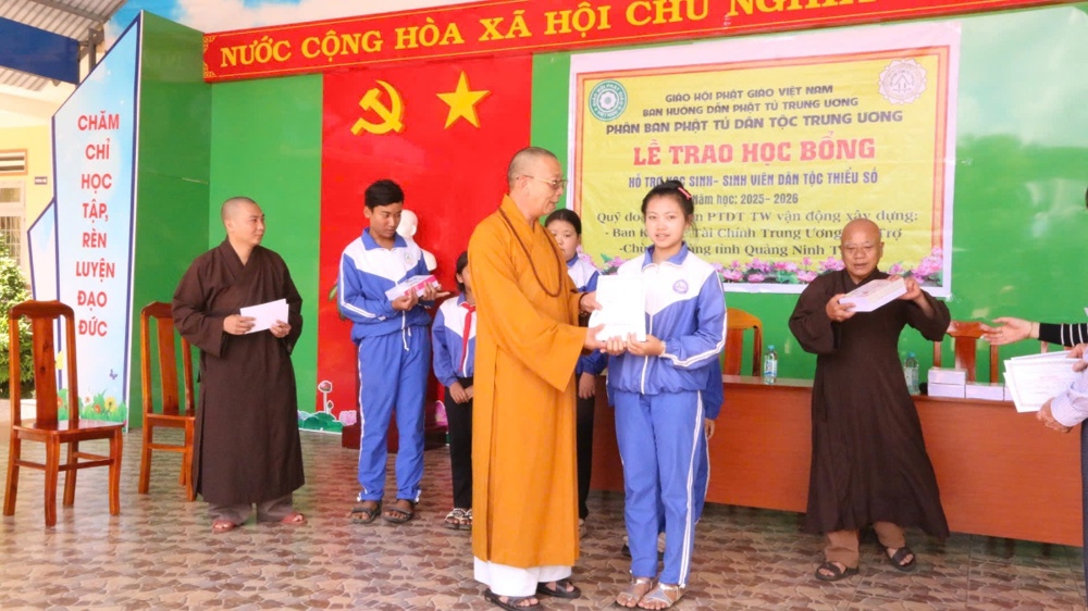 Mỗi suất học bổng có tổng giá trị 3 triệu đồng/năm học. Số tiền được chư Tôn Đức Phân ban trao làm hai đợt để hỗ trợ kịp thời cho các em: 2 triệu đồng được trao trong đợt I (học kỳ 1) và 1 triệu đồng được trao tiếp trong đợt II (học kỳ 2). Đây là sự hỗ trợ thiết thực, giúp các em trang trải chi phí học tập và chuyên tâm đến trường.