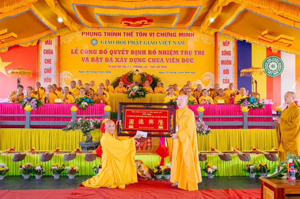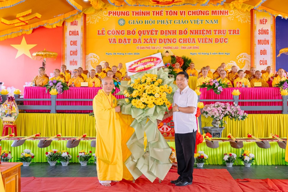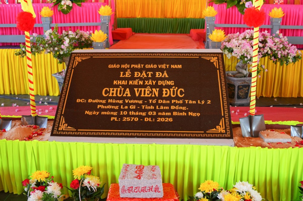 PSO - Sáng ngày 26/4/2026 (nhằm ngày 10/3 năm Bính Ngọ), tại phường La Gi, tỉnh Lâm Đồng, Ban Trị sự GHPGVN tỉnh đã trang nghiêm tổ chức lễ công bố Quyết định thành lập, bổ nhiệm trụ trì và đặt đá xây dựng chùa Viên Đức.