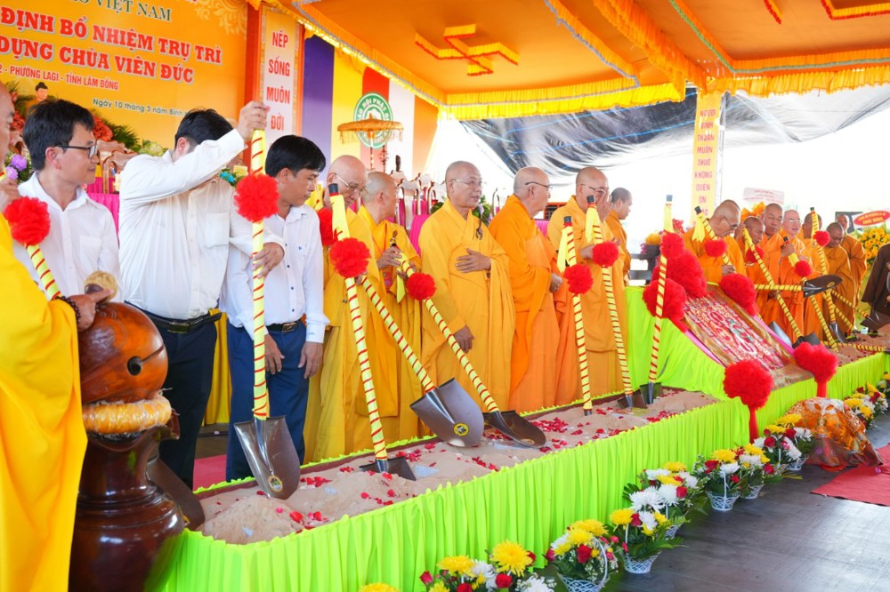 Sau lời cảm tạ của Đại đức Thích Đức Thành – đại diện Ban Tổ chức, chư Tôn giáo phẩm đã quang lâm khu vực xây dựng, cử hành nghi thức sái tịnh, động thổ và đặt đá khởi công xây dựng chùa Viên Đức theo nghi lễ thiền môn.