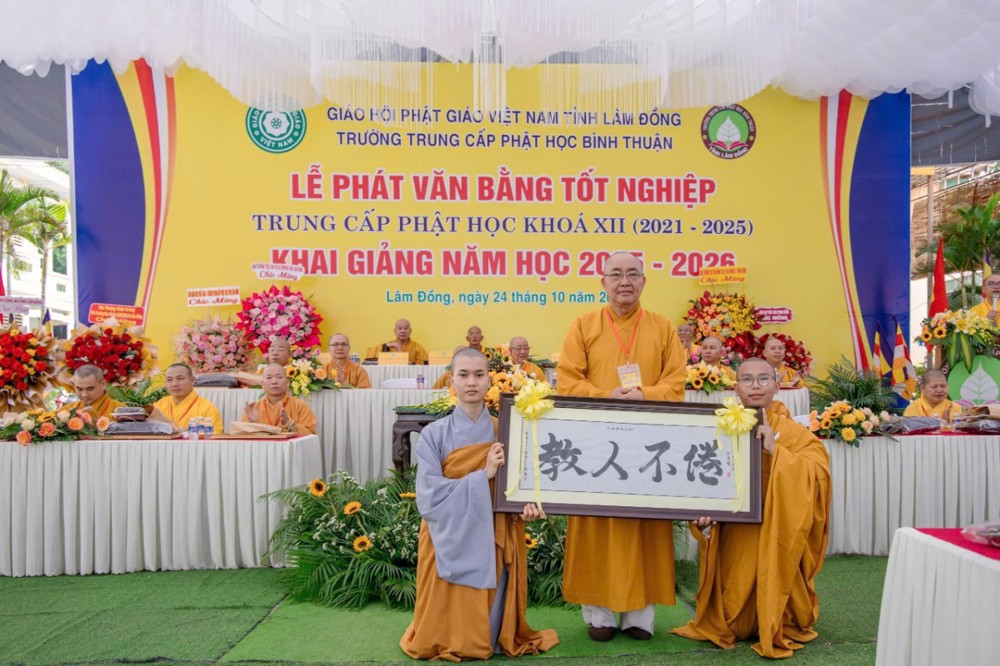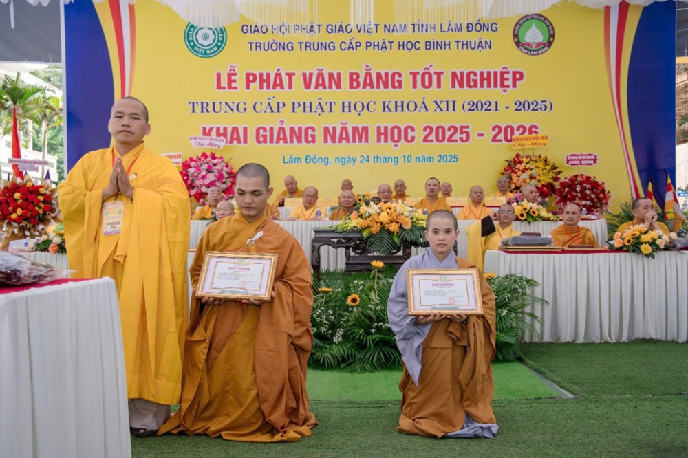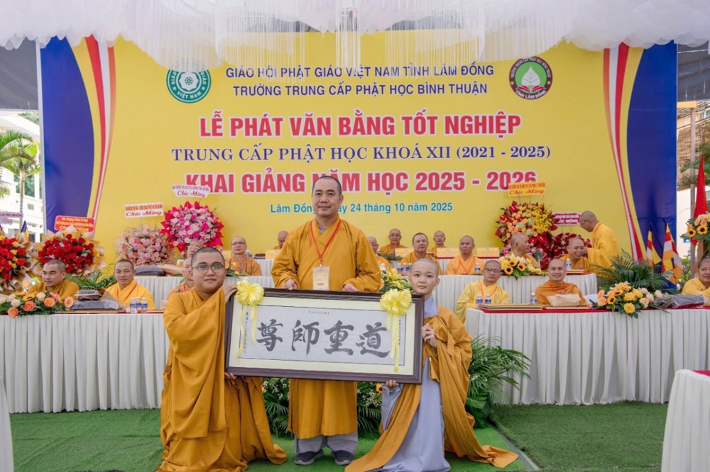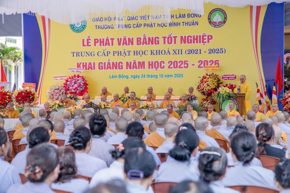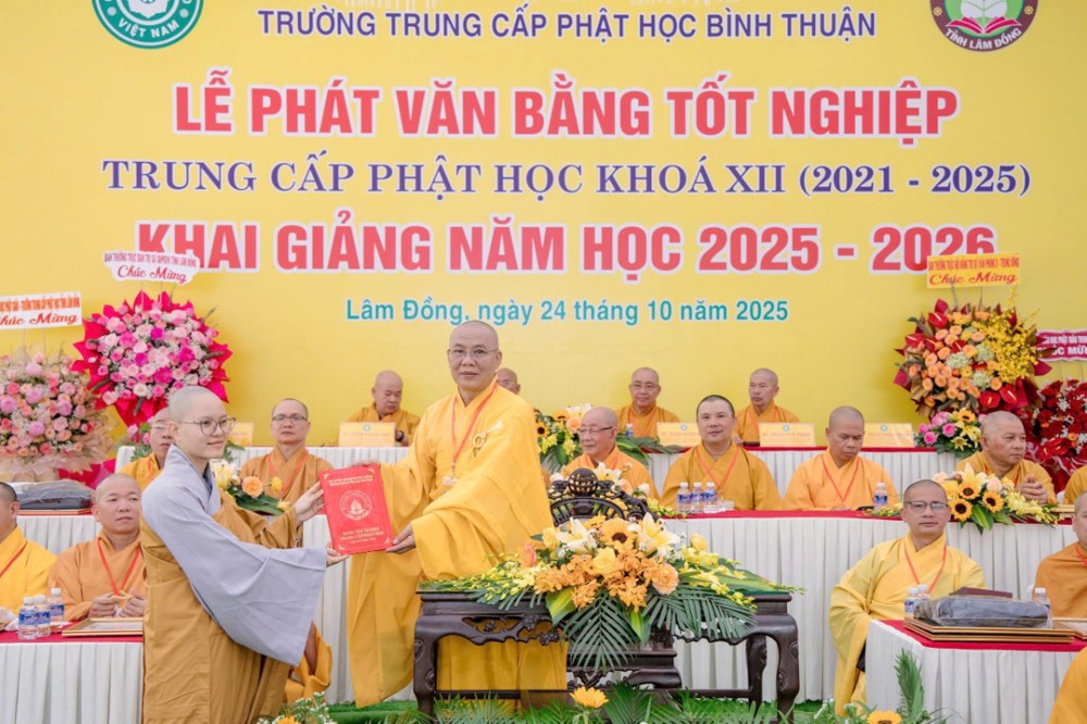 PSO- Sáng ngày 24/10/2025 (nhằm ngày 4 tháng 9 năm Ất Tỵ), tại Trường Trung cấp Phật học Bình Thuận (cũ) – Chùa Vạn Thiện, số 22 Hùng Vương, phường Phú Thủy, Ban Giám hiệu Nhà trường đã long trọng tổ chức Lễ phát văn bằng tốt nghiệp Khóa XII (2021–2025) và khai giảng năm học 2025–2026 trong không khí trang nghiêm, thấm đượm tinh thần tri ân và tiếp nối truyền thống hơn 30 năm đào tạo Tăng tài cho Giáo hội Phật giáo Việt Nam.