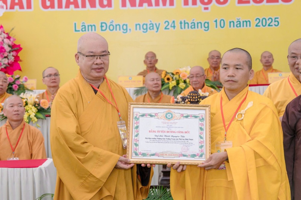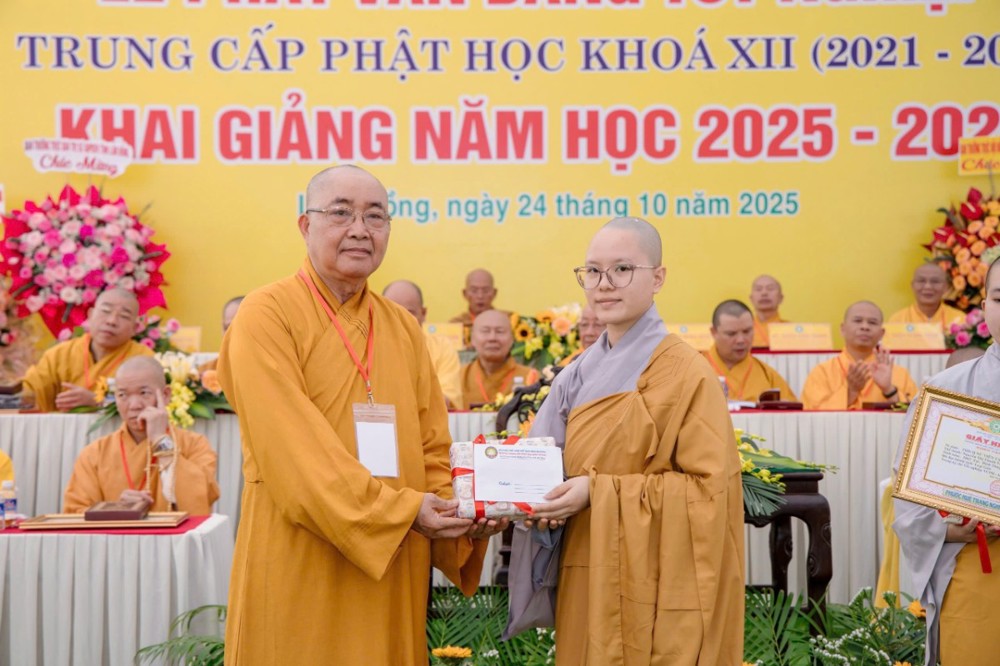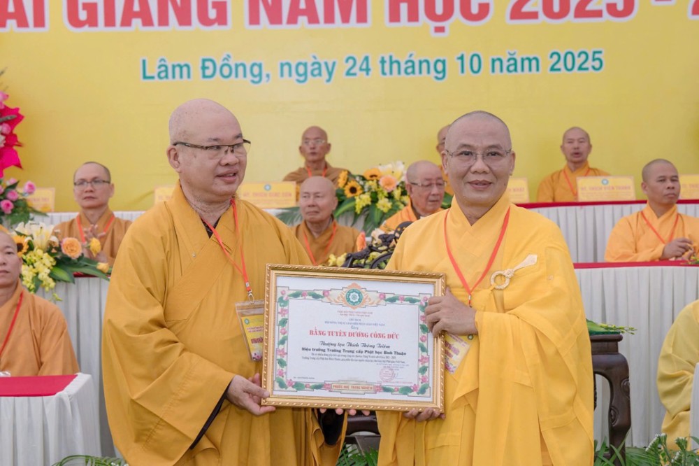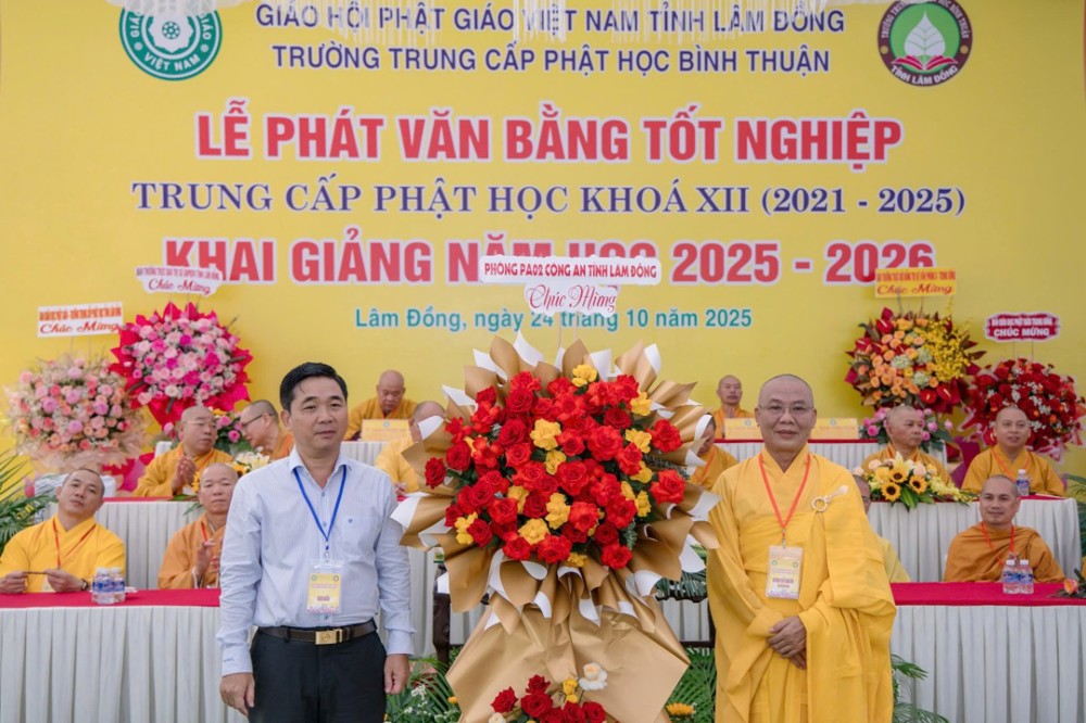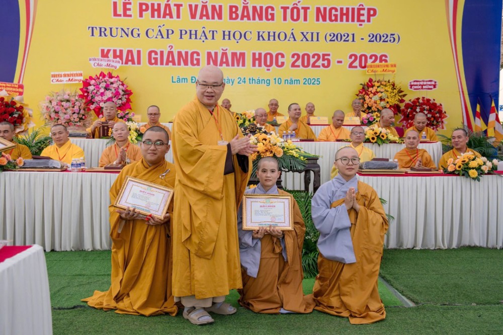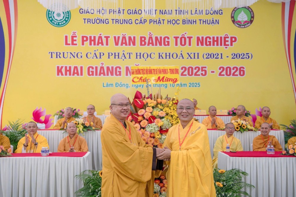 PSO- Sáng ngày 24/10/2025 (nhằm ngày 4 tháng 9 năm Ất Tỵ), tại Trường Trung cấp Phật học Bình Thuận (cũ) – Chùa Vạn Thiện, số 22 Hùng Vương, phường Phú Thủy, Ban Giám hiệu Nhà trường đã long trọng tổ chức Lễ phát văn bằng tốt nghiệp Khóa XII (2021–2025) và khai giảng năm học 2025–2026 trong không khí trang nghiêm, thấm đượm tinh thần tri ân và tiếp nối truyền thống hơn 30 năm đào tạo Tăng tài cho Giáo hội Phật giáo Việt Nam.