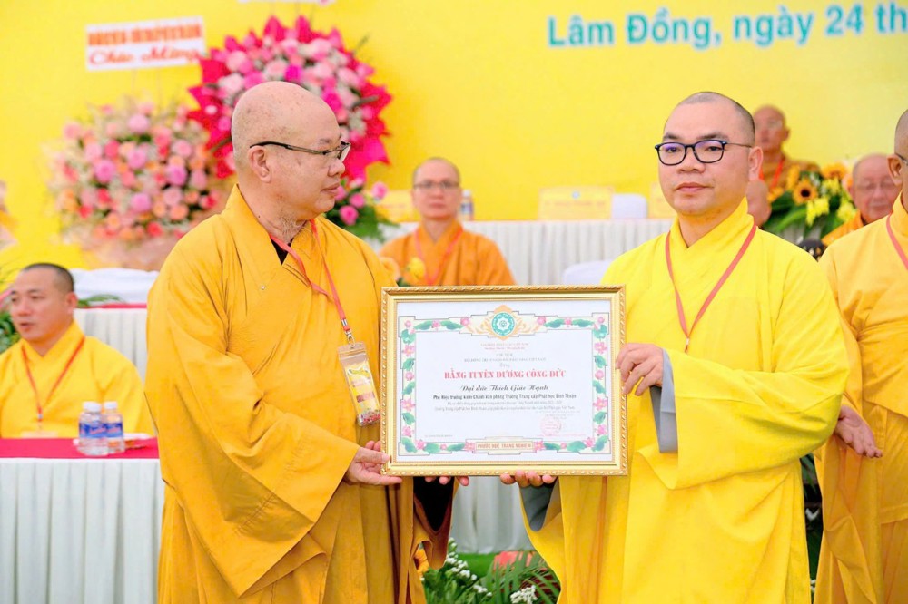 Trong phần tuyên dương công đức, Trung ương Giáo hội công bố quyết định tuyên dương công đức đến tập thể Ban Giám hiệu, Ban Giảng huấn; Ban Trị sự GHPGVN tỉnh cũng tuyên dương công đức các tập thể và thành viên Ban Bảo trợ Nhà trường. Cư sĩ Tâm Quang – Phó Hiệu trưởng, đại diện Ban Giám hiệu, công bố danh sách Tăng Ni sinh đạt thành tích xuất sắc trong học tập và tốt nghiệp.