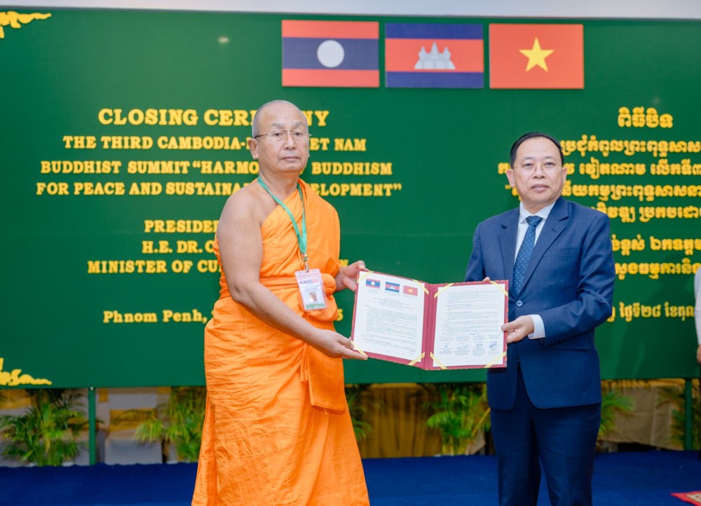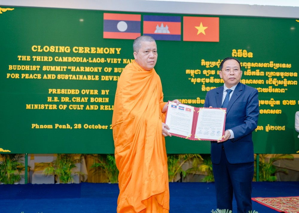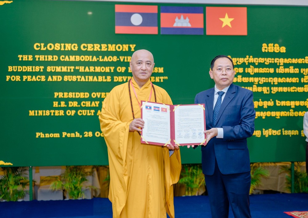 Tại phiên bế mạc, đại diện lãnh đạo Hội đồng Giáo hội Tăng-già Vương quốc Campuchia, Liên minh Trung ương Phật giáo Lào và Trung ương Giáo hội Phật giáo Việt Nam đã cùng nhất trí thông qua và ký kết Tuyên bố chung Phnom Penh, khẳng định cam kết cùng nhau gìn giữ, phát huy giá trị di sản Phật giáo, tăng cường hợp tác khu vực và đóng góp tích cực cho hòa bình, hòa hợp, phát triển bền vững.