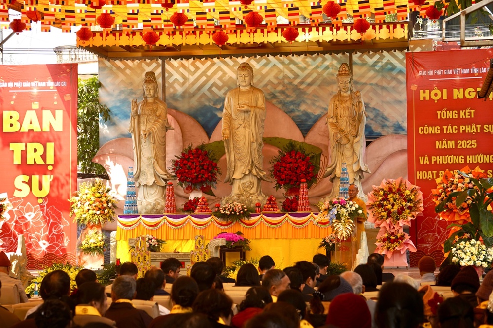 Đại diện chính quyền Ông Trần Phùng - Phó giám đốc sở Dân Tộc và Tôn giáo tỉnh phát biểu ghi nhận và đánh giá cao những thành tựu Phật giáo tỉnh Lào Cai đã đạt được, bày tỏ sự trân trọng đối với những đóng góp xuất sắc của chư Tôn đức Tăng Ni và Phật giáo tỉnh Lào Cai trong năm 2025. Đặc biệt là sự nỗ lực kiện toàn bộ máy sau khi có quyết định thành lập Ban Trị sự mới. Lãnh đạo ngành tôn giáo khẳng định sẽ phối hợp chặt chẽ để tháo gỡ các vướng mắc phát sinh. Cơ quan chức năng cũng đặc biệt khuyến khích Ban Trị sự rà soát, hướng dẫn các đạo tràng đăng ký điểm sinh hoạt tôn giáo tập trung tại các khu vực chưa có chùa để đảm bảo quyền lợi và tính pháp lý cho Phật tử.