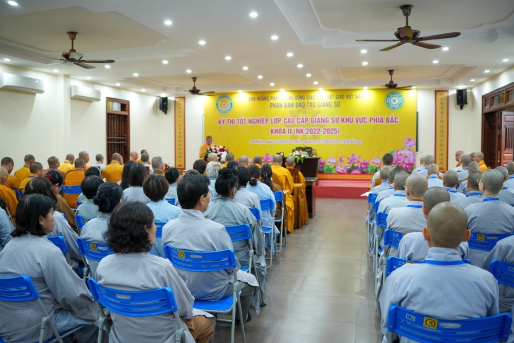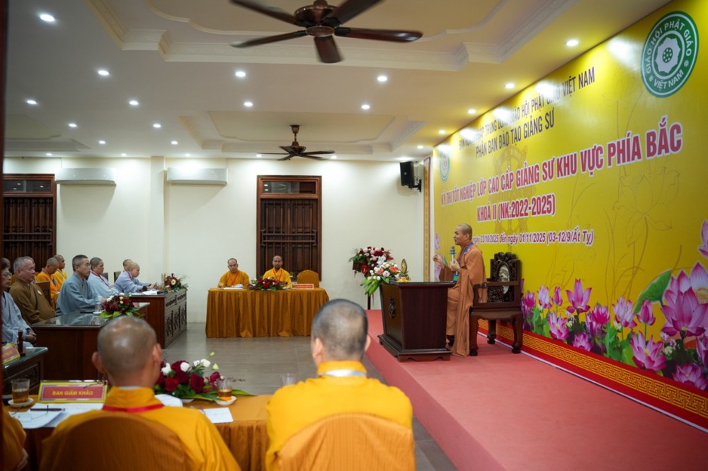 Trong lời đạo từ, Thượng tọa Thích Chiếu Tuệ - Trưởng Ban điều hành lớp Cao cấp Giảng sư khu vực phía Bắc đã gửi lời chào mừng và tri ân đến chư Tôn đức Ban Hoằng pháp, Hội đồng thi cùng quý Phật tử đã đồng hành trong suốt khóa học. Thượng tọa tán thán tinh thần tu học của Tăng Ni giảng sinh khóa II, đã đầy đủ Giới – Định – Tuệ để bước vào kỳ thi tốt nghiệp kéo dài 10 ngày (từ 3 – 12 tháng 9 năm Ất Tỵ). Thượng tọa nhấn mạnh, kỳ thi không chỉ nhằm đánh giá năng lực và trí tuệ, mà còn phản ánh tâm huyết, sự tinh tấn và chí nguyện hoằng pháp lợi sinh của mỗi giảng sinh. Thượng tọa mong quý Tăng, Ni học phải đi đôi với hành, kiến thức cần được chuyển hóa thành thực tiễn hoằng pháp. Cuối lời, Thượng tọa cầu chúc kỳ thi thành tựu viên mãn, đạo quả sáng ngời.