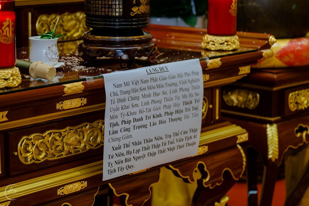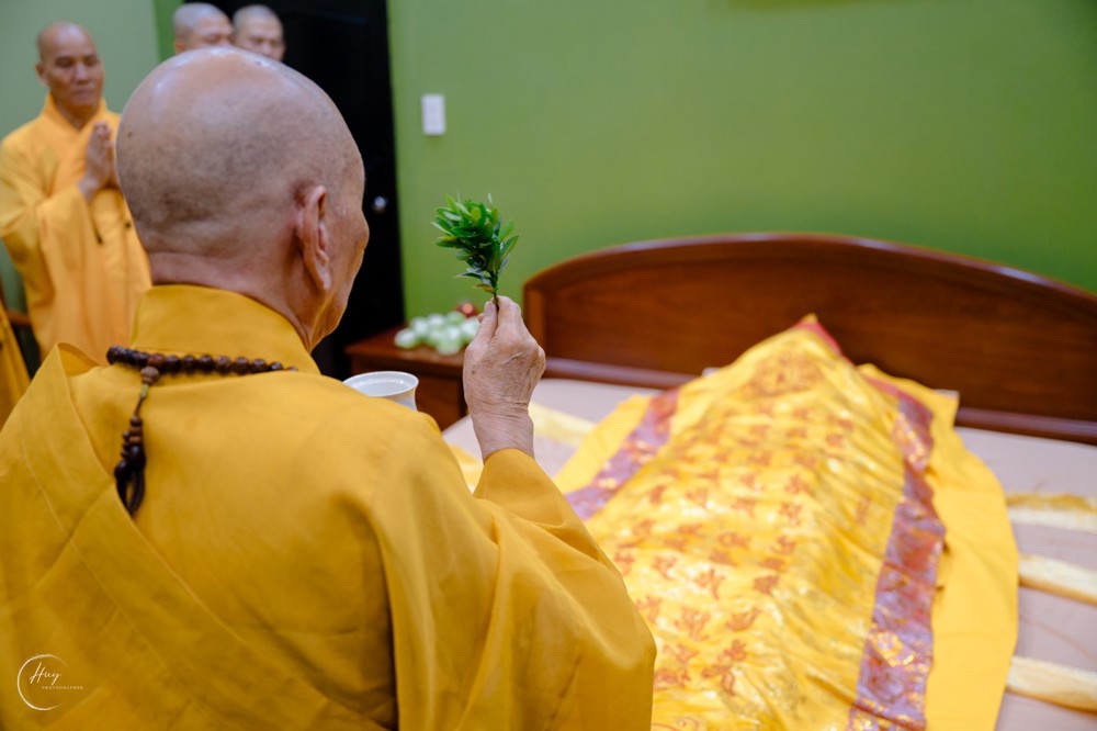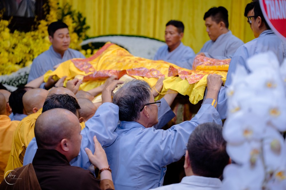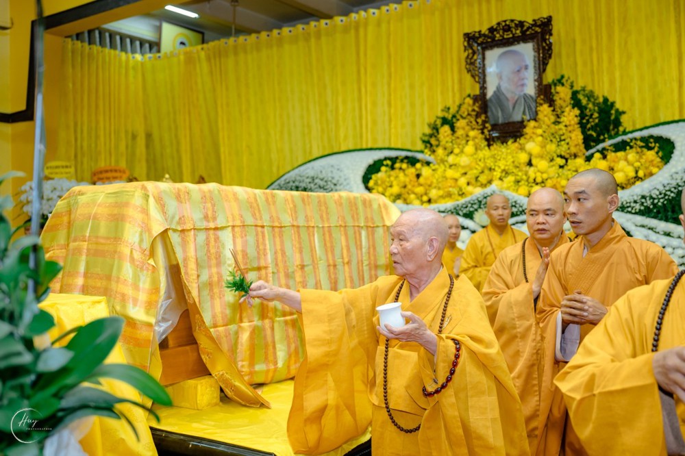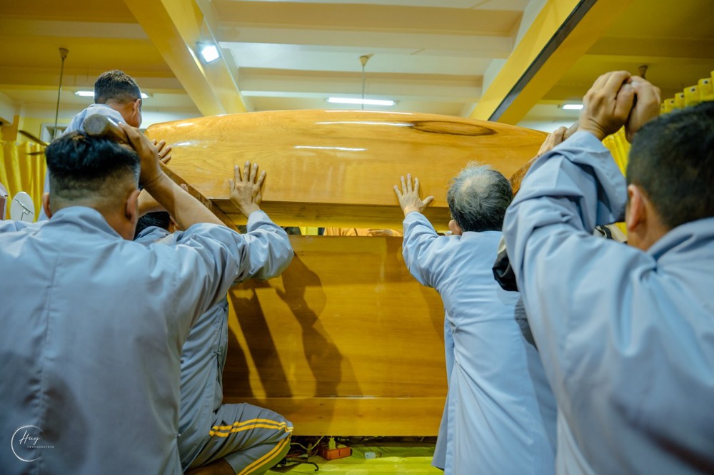 Thượng tọa Thích Thanh Phong – Phó Chủ tịch Hội đồng Trị sự, Trụ trì Tổ đình Vĩnh Nghiêm, cùng môn đồ pháp quyến cung thỉnh nhục thân Trưởng lão Hòa thượng từ phương trượng về Giác linh đường trong tiếng chuông trống Bát Nhã ngân vang. Nghi thức nhập kim quan được cử hành trang trọng, theo nghi lễ cổ truyền, thể hiện lòng tôn kính sâu sắc đối với bậc Thạc đức cao Tăng.