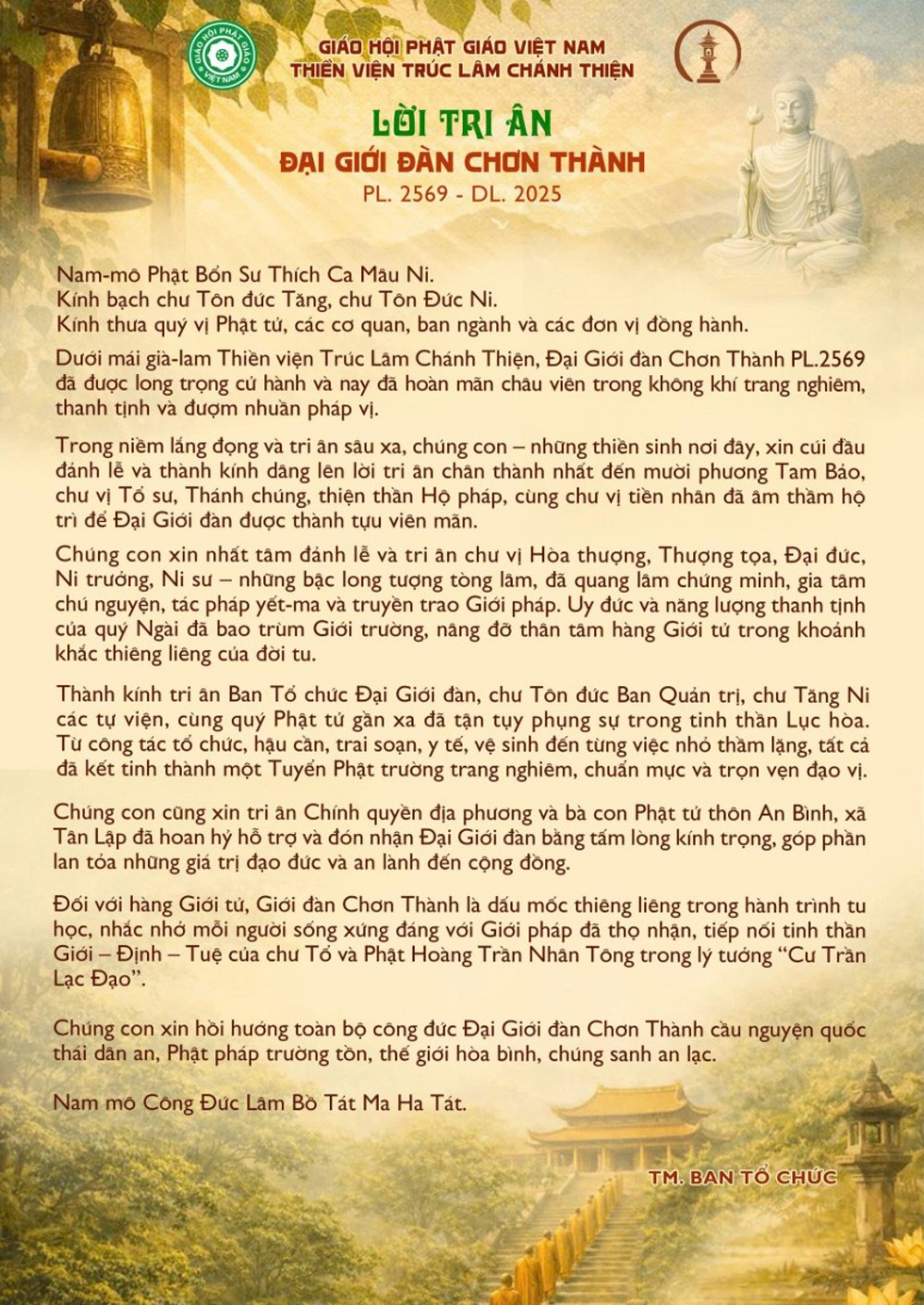 Thành kính tri ân Ban Tổ chức Đại Giới đàn, chư Tôn đức Ban Quản trị, chư Tăng Ni các tự viện, cùng quý Phật tử gần xa đã tận tụy phụng sự trong tinh thần Lục hòa.