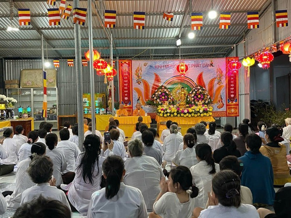 Thời kinh Khánh đản dưới sự hướng dẫn của Ni sư Nghiêm Liên, với sự tham dự của Phật tử tại Chùa Thuận Phước và quý Phật tử trên Zoom. Sau đó Ni sư Tuệ Liên – Cố vấn Trụ trì Chùa Thuận Phước – đã có thời pháp thoại chia sẻ với đại chúng về ý nghĩa thiêng liêng của ngày Đức Phật đản sinh. Ni sư bày tỏ niềm hoan hỷ khi Việt Nam vinh dự đăng cai tổ chức Đại lễ Vesak Liên Hợp Quốc năm 2025, từ ngày 6 đến 8 tháng 5, với sự tham dự của hơn 2.700 đại biểu đến từ 85 quốc gia và vùng lãnh thổ. Đây là lần thứ tư Việt Nam đăng cai sự kiện trọng đại này, một lần nữa khẳng định vai trò tích cực và tiếng nói uy tín của Phật giáo Việt Nam trên trường quốc tế. Ni sư cho biết, chủ đề của Đại lễ Vesak năm nay là: “Đoàn kết và bao dung vì nhân phẩm con người: Tuệ giác Phật giáo vì hòa bình thế giới và phát triển bền vững”. Ni sư Tuệ Liên cũng xúc động nhắc đến việc xá lợi Phật được cung thỉnh từ Ấn Độ về Việt Nam trong dịp này – như một biểu tượng linh thiêng kết nối giữa quê hương Đức Phật và đất nước Việt Nam, nơi đạo Phật đã đồng hành cùng dân tộc qua bao thăng trầm lịch sử. Đồng thời, hình ảnh trái tim bất diệt của Bồ tát Thích Quảng Đức – hiện đang được tôn trí tại Việt Nam Quốc Tự – cũng được Ni sư nhắc đến như một minh chứng sống động cho tinh thần đại hùng, đại lực, đại từ bi của hàng Tăng Ni Việt Nam trong công cuộc phụng sự Đạo pháp và dân tộc.