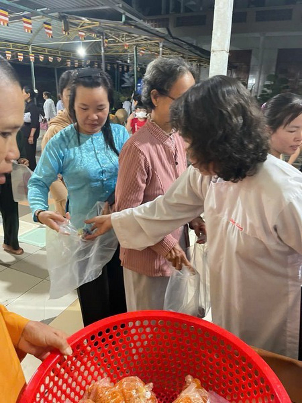 Kết thúc buổi lễ, quý Phật tử được mời thưởng thức các món ăn vặt tại gian hàng “Không đồng”. Mỗi người tham dự đều được nhận phiếu ẩm thực như một món quà Phật đản, cùng nhau thưởng thức những món chay dân dã như bánh tráng trộn, xoài lắc, cóc lắc, bánh kẹo, trái cây, nước uống…