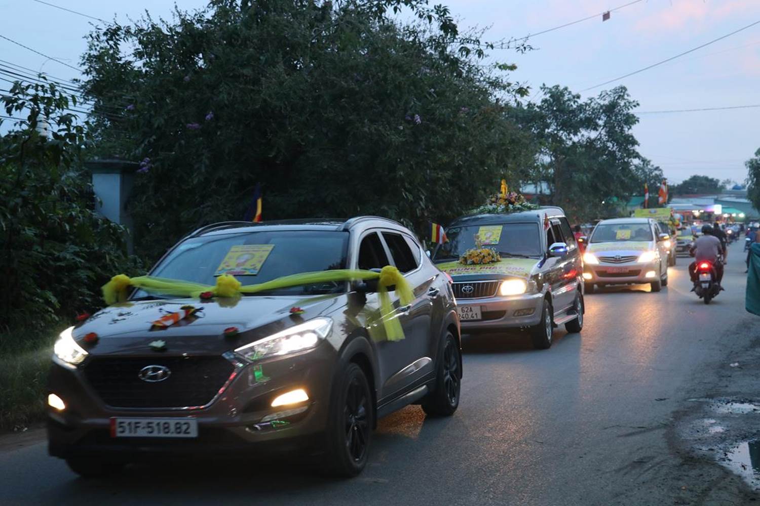 Theo lộ trình, đoàn xe xuất phát tại chùa Pháp Minh (ấp Giồng Lớn, xã Mỹ Hạnh Nam) → đường tỉnh lộ 824 (ngã 3 Mỹ Hạnh) → quay về đường tỉnh 824 → chùa Linh Nguyên; chùa Long Thành (ấp Bình Tả 1, xã Đức Hòa Hạ) → chùa Pháp Thạnh (ấp 2, xã Hựu Thạnh) → quay về đường tỉnh 825 → Ngã tư thị trấn Hậu Nghĩa → hướng về đường tỉnh 823 (Ngã tư Đức Lập) → đường Đức Hòa Thượng → về lại chùa Pháp Minh.