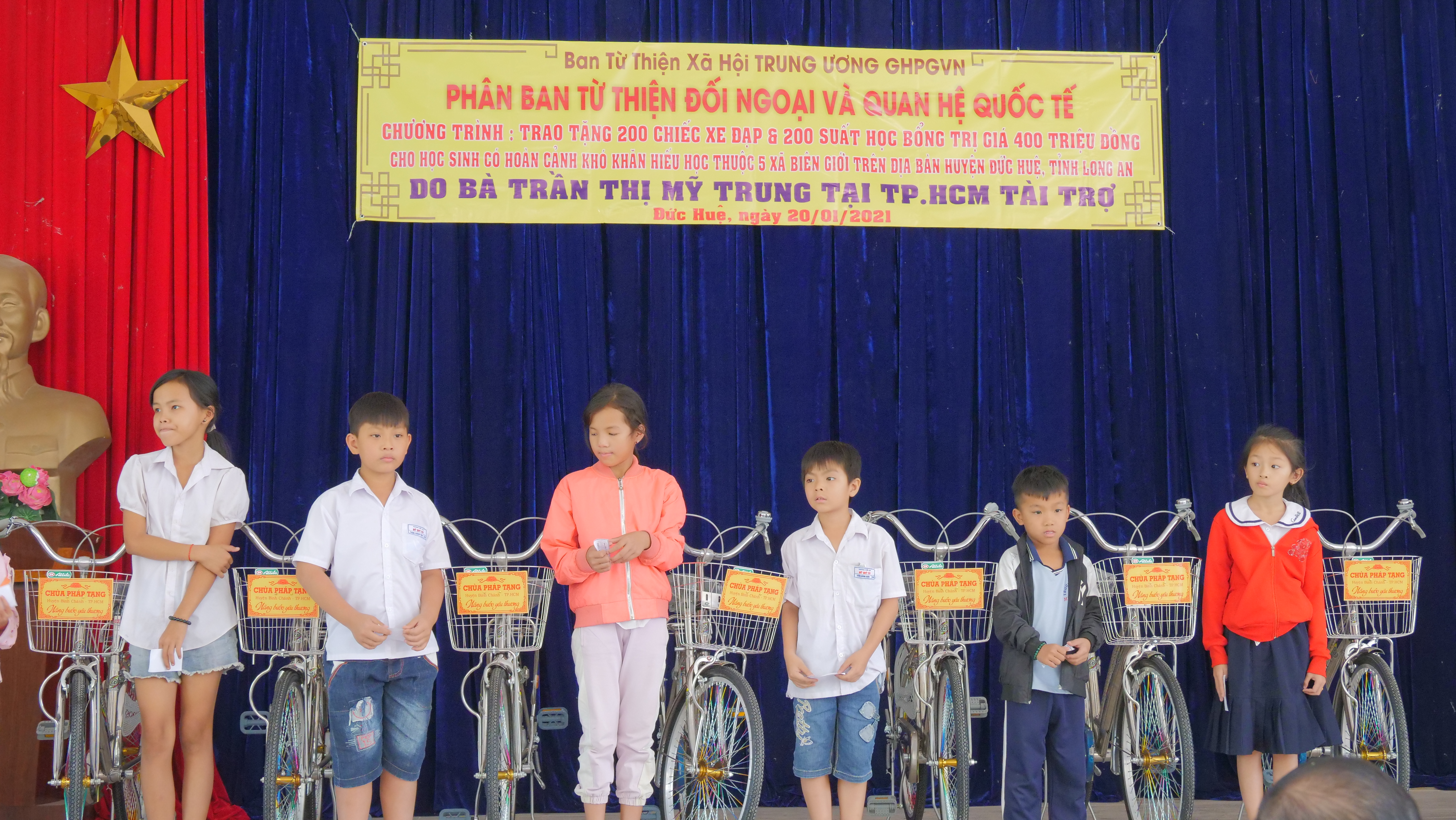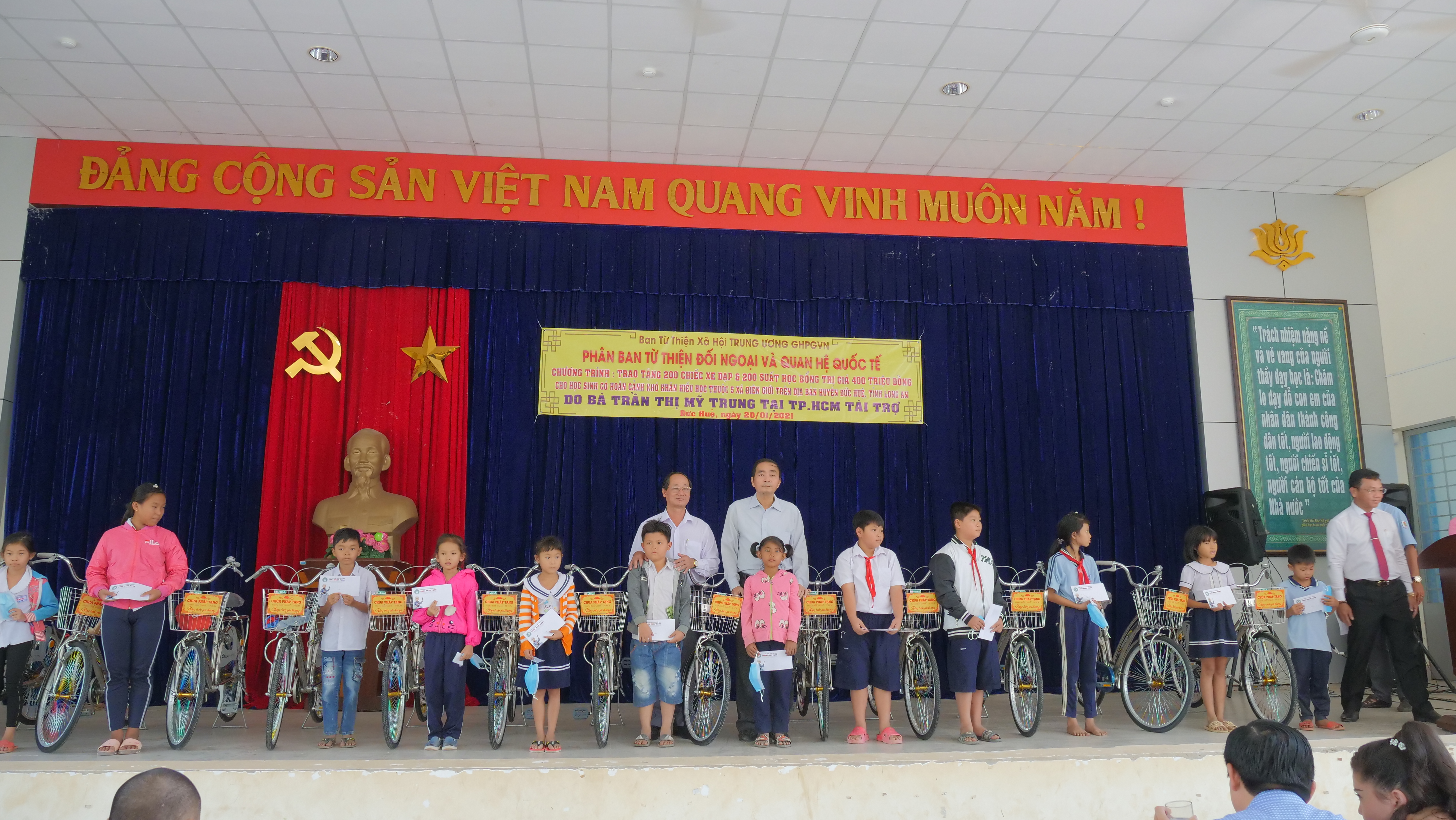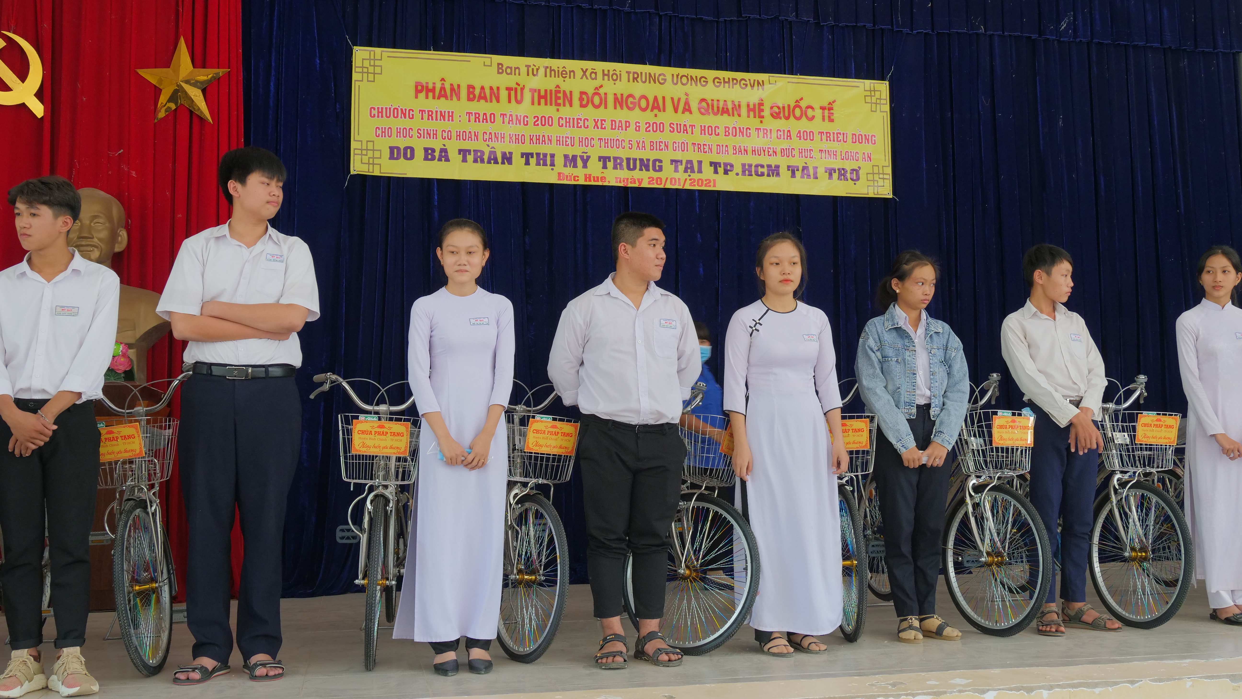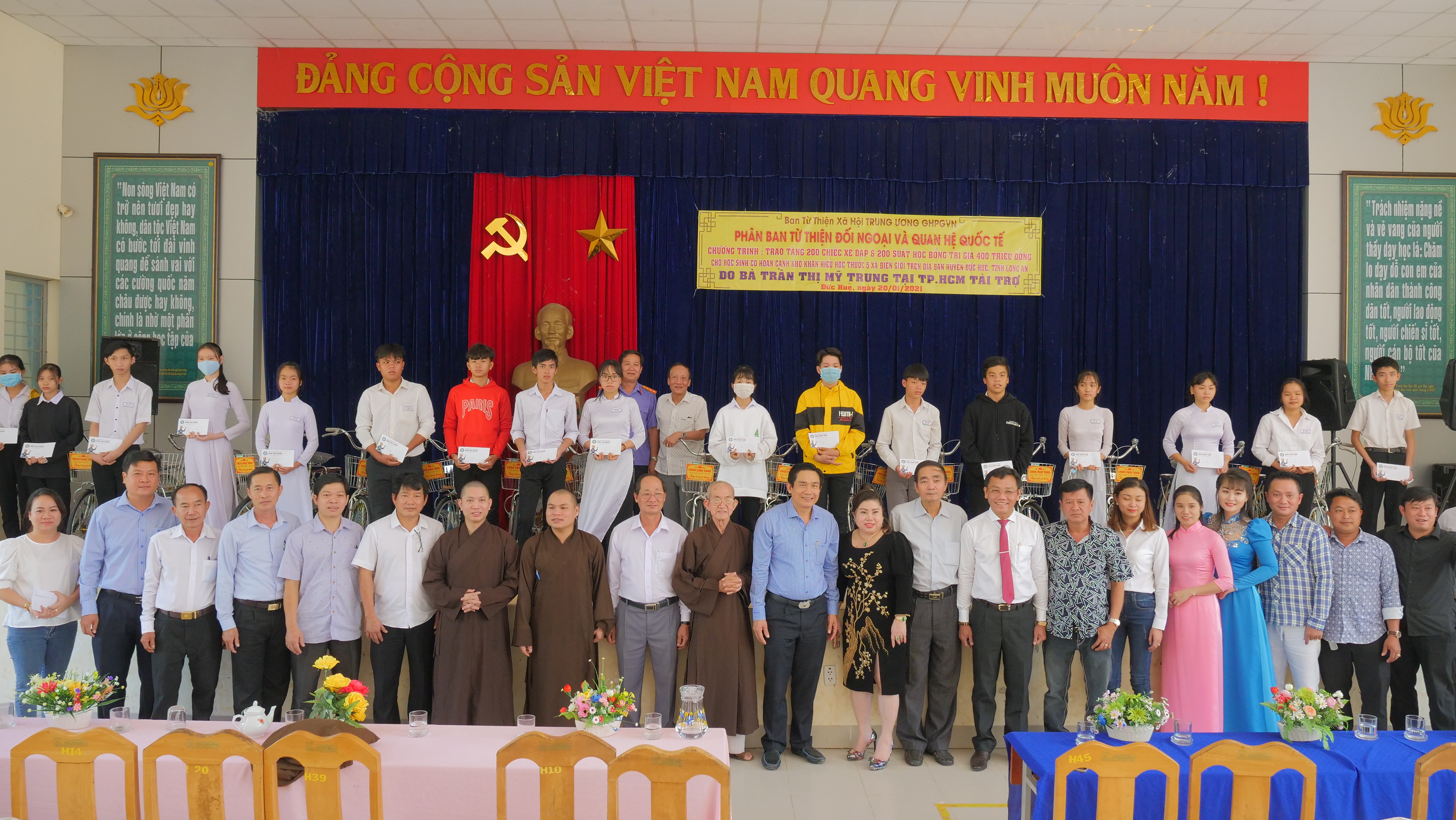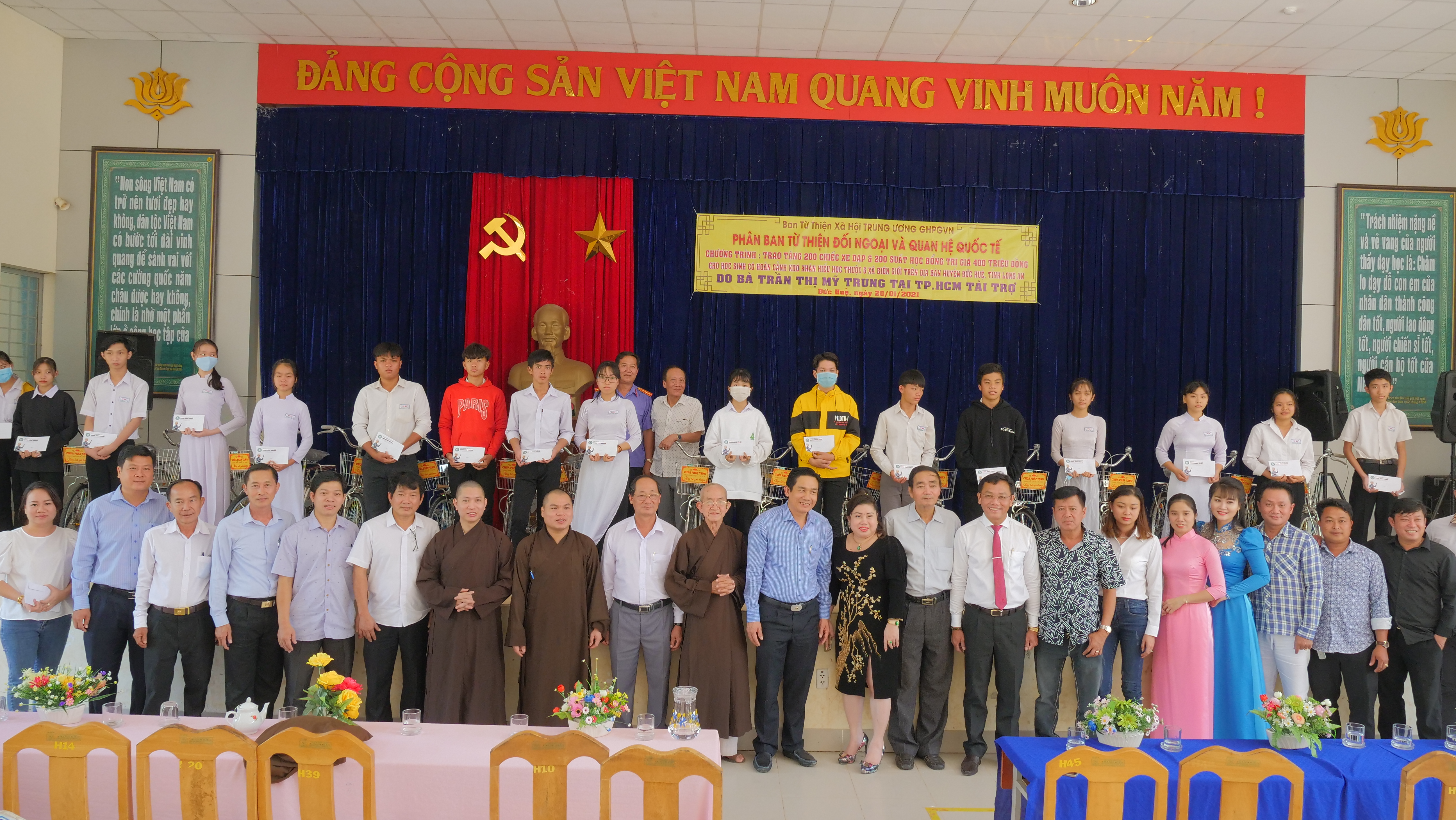 PSO - Truyền thống hiếu học từ ngàn xưa đến nay vẫn luôn là niềm tự hào của người con đất Việt. Nêu cao tinh thần đó và tiếp thêm nguồn khích lệ cho các em học sinh hiếu học có hoàn cảnh khó khăn trên địa bàn huyện Đức Huệ, tỉnh Long An. Nhân kỷ niệm ngày Phật Thích Ca Thành Đạo, lan tỏa tinh thần Từ bi – Giác ngộ của nhà Phật, ngày 20/01/2021 (nhằm mùng 8/12 năm Canh Tý), Phân ban Từ thiện Đối ngoại và Quan hệ (ĐN&QH) Quốc tế đã thực hiện chương trình trao tặng 200 học bổng và 200 xe đạp cho các em hiếu học, khó khăn trong niên học 2020-2021.