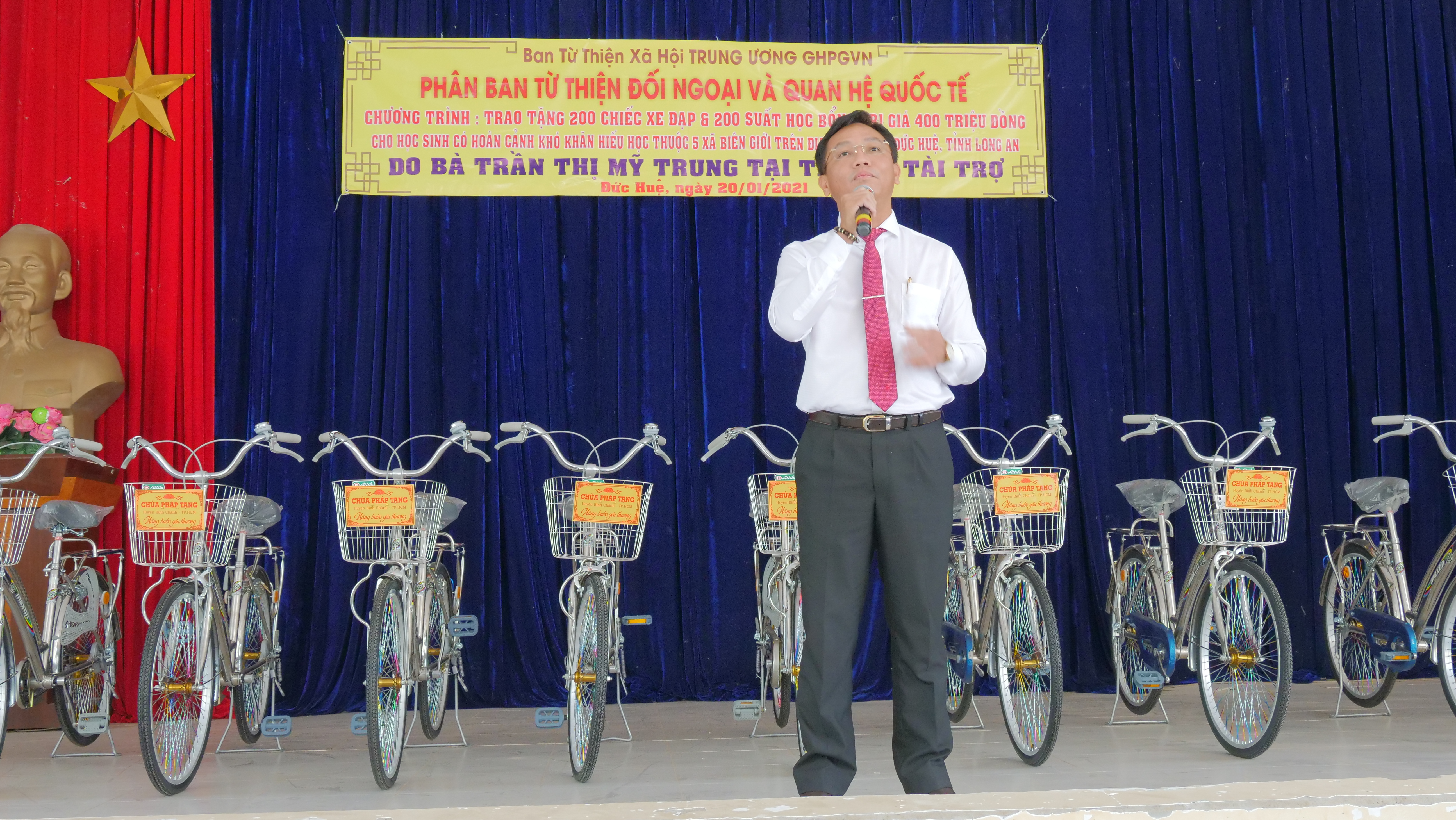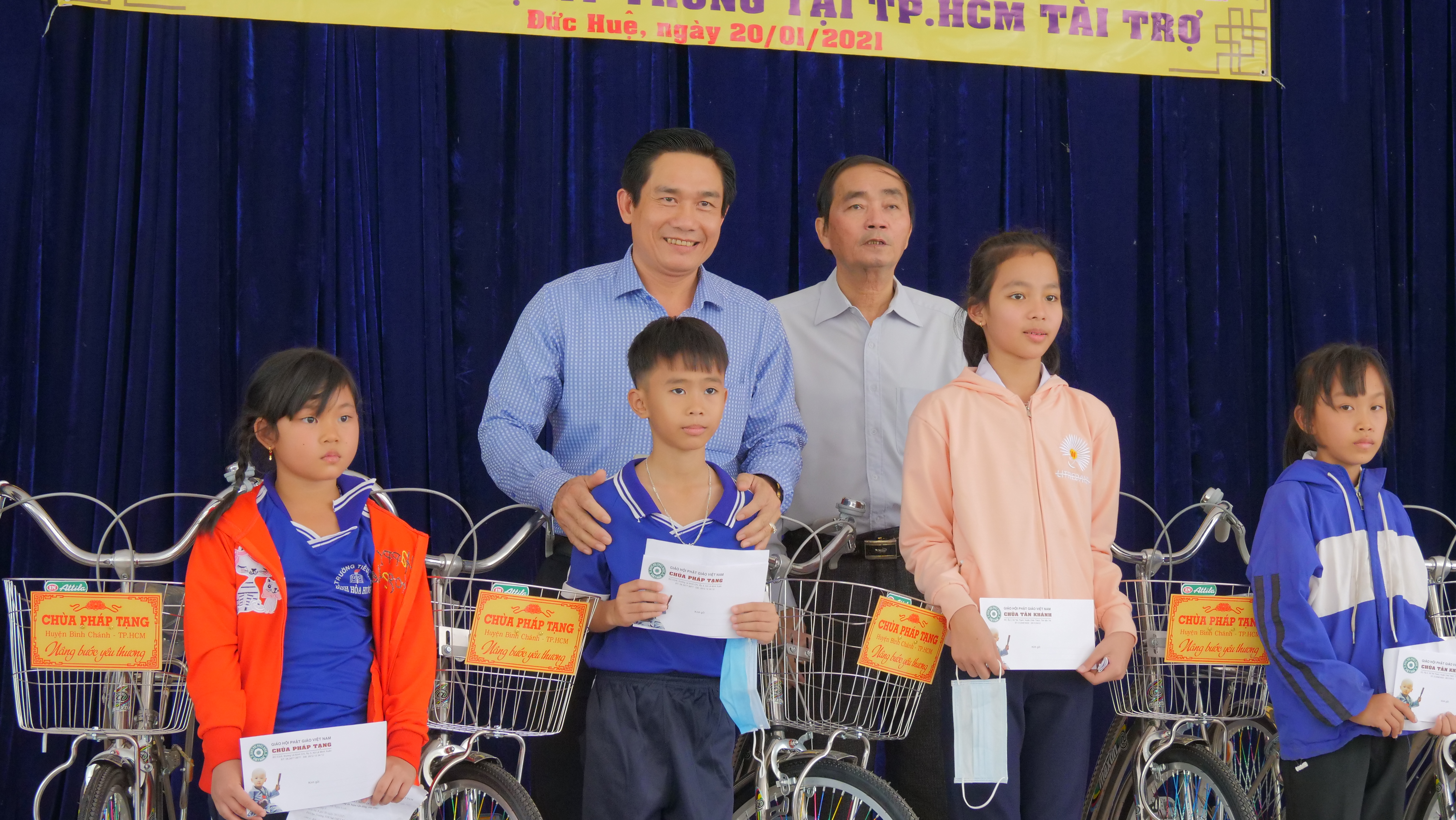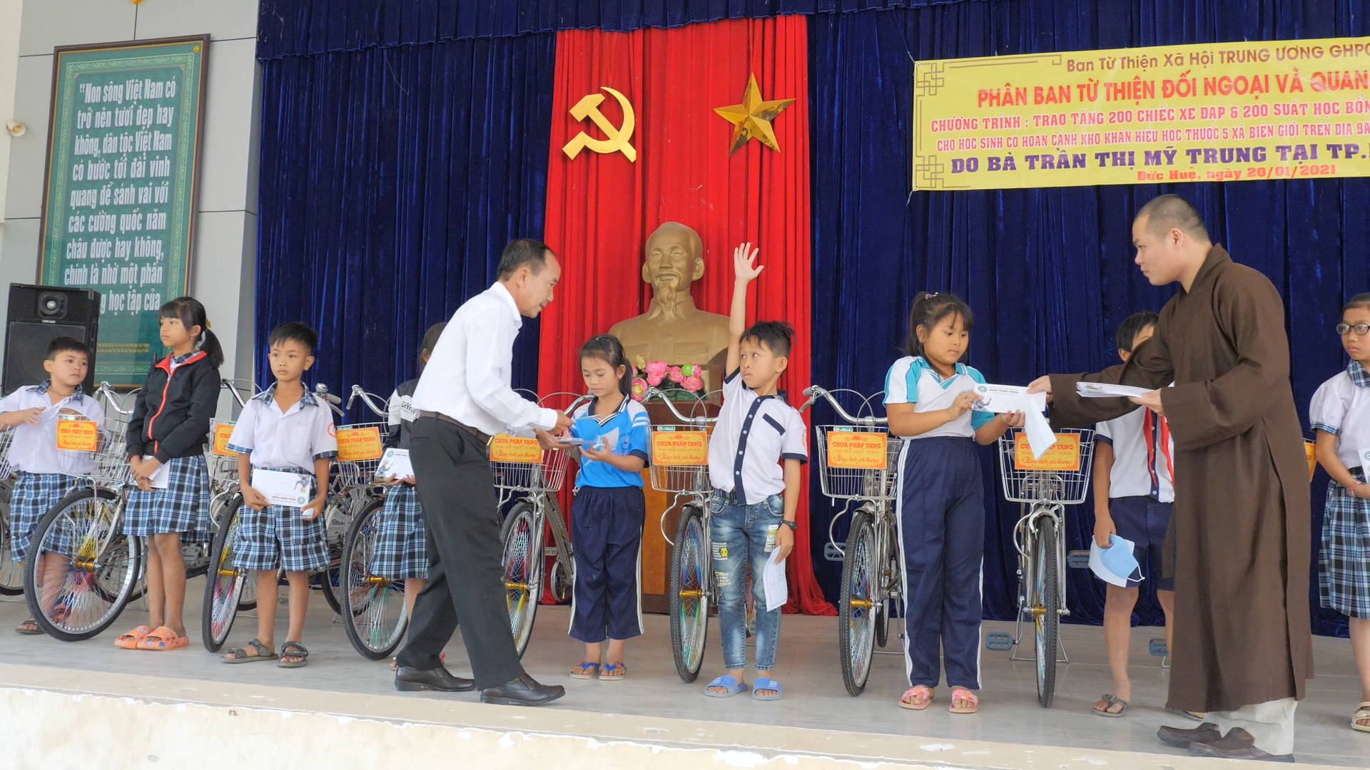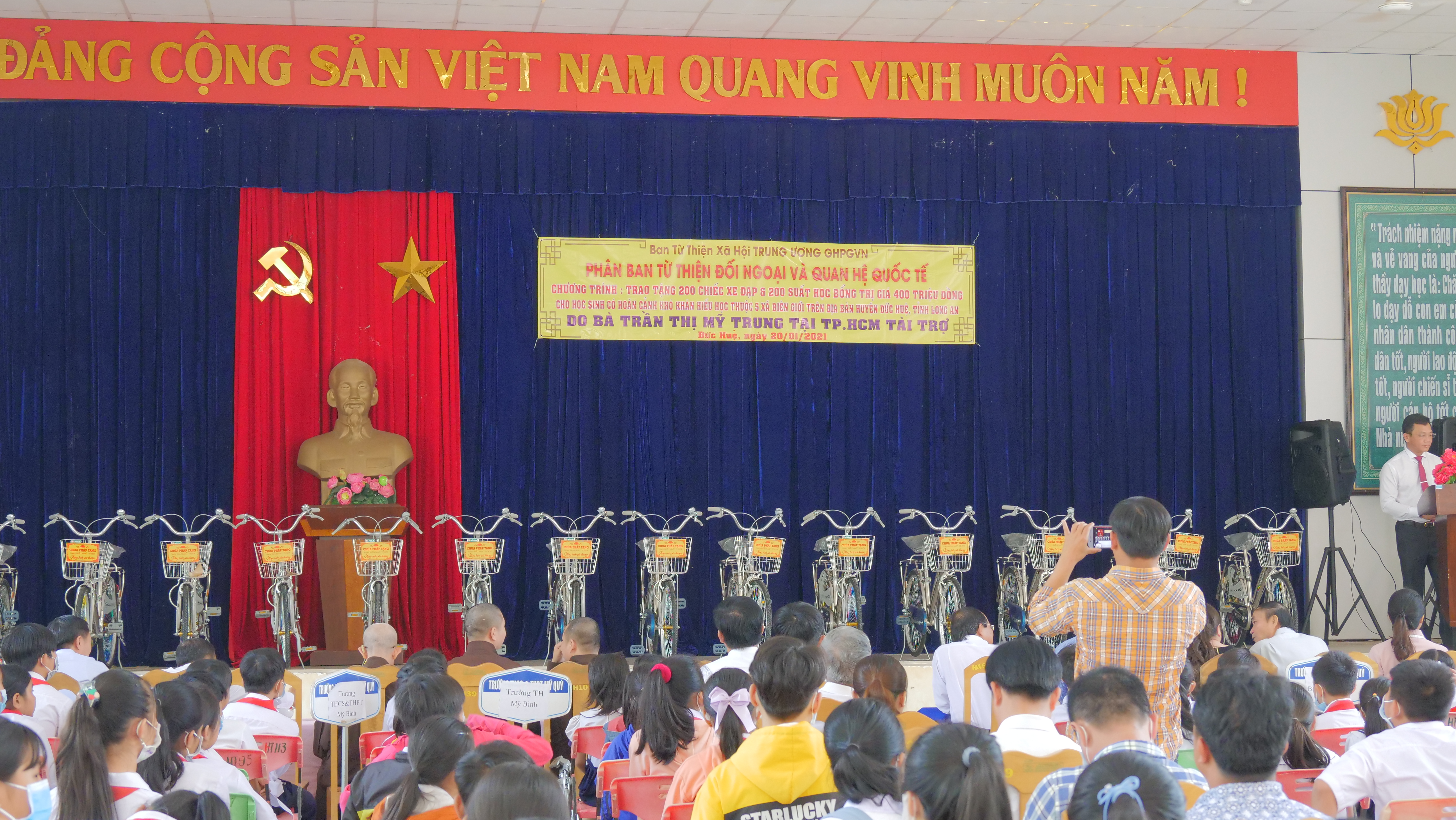 PSO - Truyền thống hiếu học từ ngàn xưa đến nay vẫn luôn là niềm tự hào của người con đất Việt. Nêu cao tinh thần đó và tiếp thêm nguồn khích lệ cho các em học sinh hiếu học có hoàn cảnh khó khăn trên địa bàn huyện Đức Huệ, tỉnh Long An. Nhân kỷ niệm ngày Phật Thích Ca Thành Đạo, lan tỏa tinh thần Từ bi – Giác ngộ của nhà Phật, ngày 20/01/2021 (nhằm mùng 8/12 năm Canh Tý), Phân ban Từ thiện Đối ngoại và Quan hệ (ĐN&QH) Quốc tế đã thực hiện chương trình trao tặng 200 học bổng và 200 xe đạp cho các em hiếu học, khó khăn trong niên học 2020-2021.