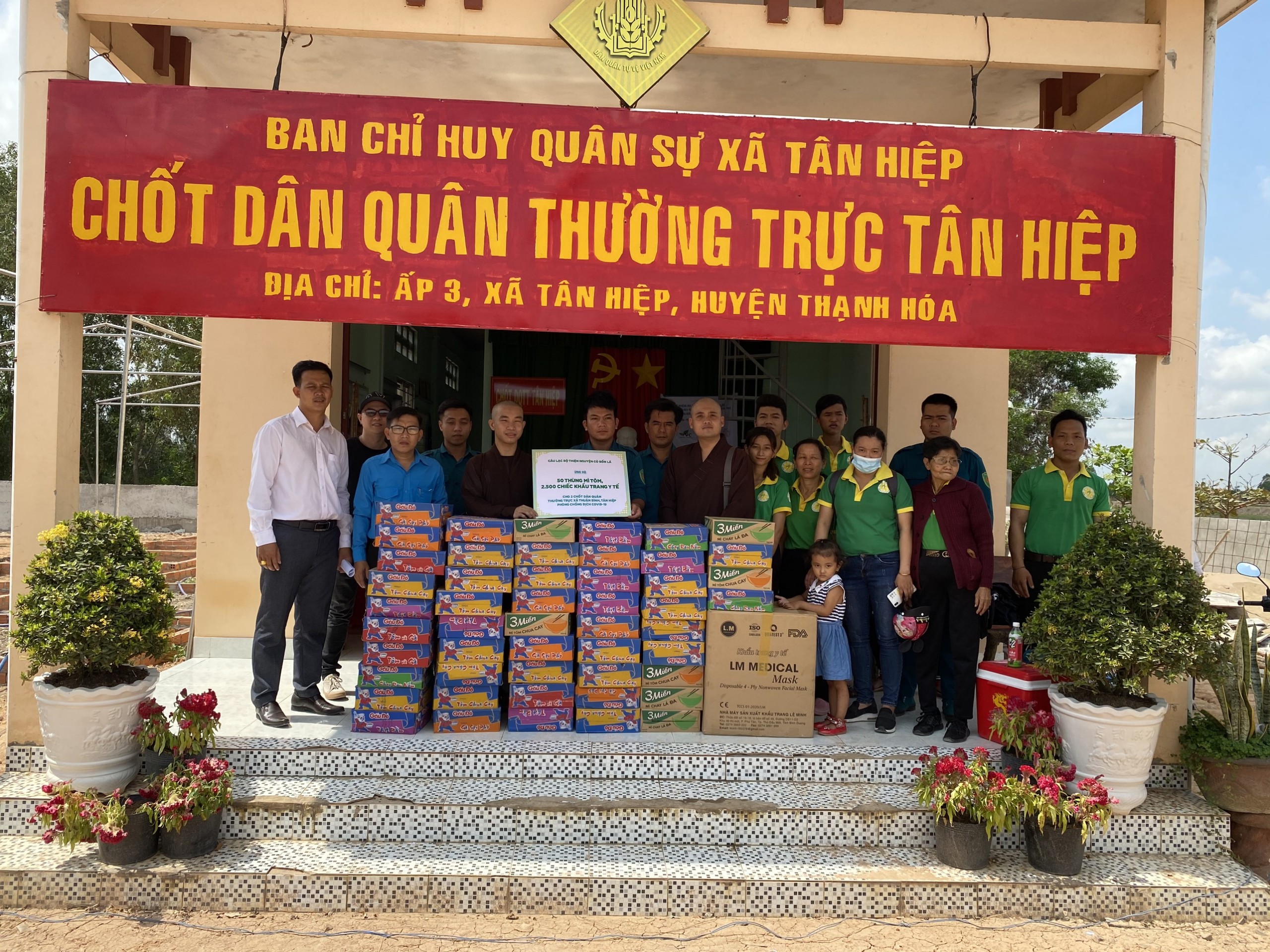 Tiếp đó, đoàn đến thăm và tặng quà cho cán bộ chiến sĩ đang làm nhiệm vụ tại 02 chốt phòng chống dịch Covid-19 trên địa bàn xã Tân Hiệp, huyện Thạch Hoá (nơi giáp ranh với nước bạn Campuchia). Tại đây, đoàn đã trao tặng 50 thùng mì và 2.500 chiếc khẩu trang cho cán bộ chiến sĩ đang làm việc tại chốt.