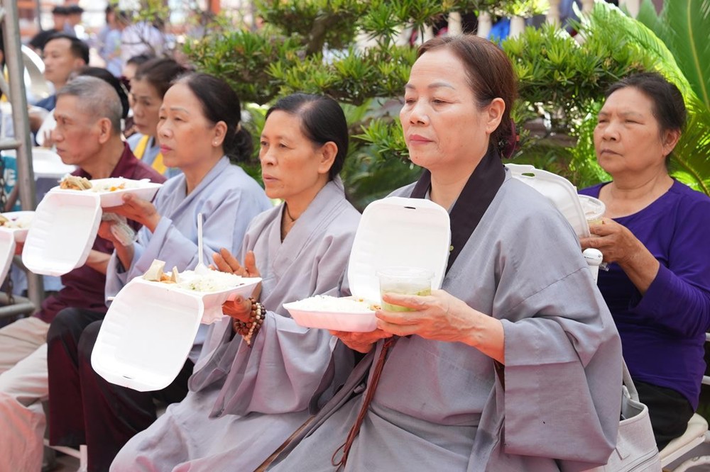 Vào buổi trưa, trên 3000 Phật tử nhận các suất cơm chay trên tay, yên lặng tĩnh tâm hướng về Hòa thượng Ân sư Thích Bảo Nghiêm và chư Tôn đức Tăng trong thời khóa cúng Ngọ và dùng cơm chay ấm áp tình thầy trò trong chính niệm.