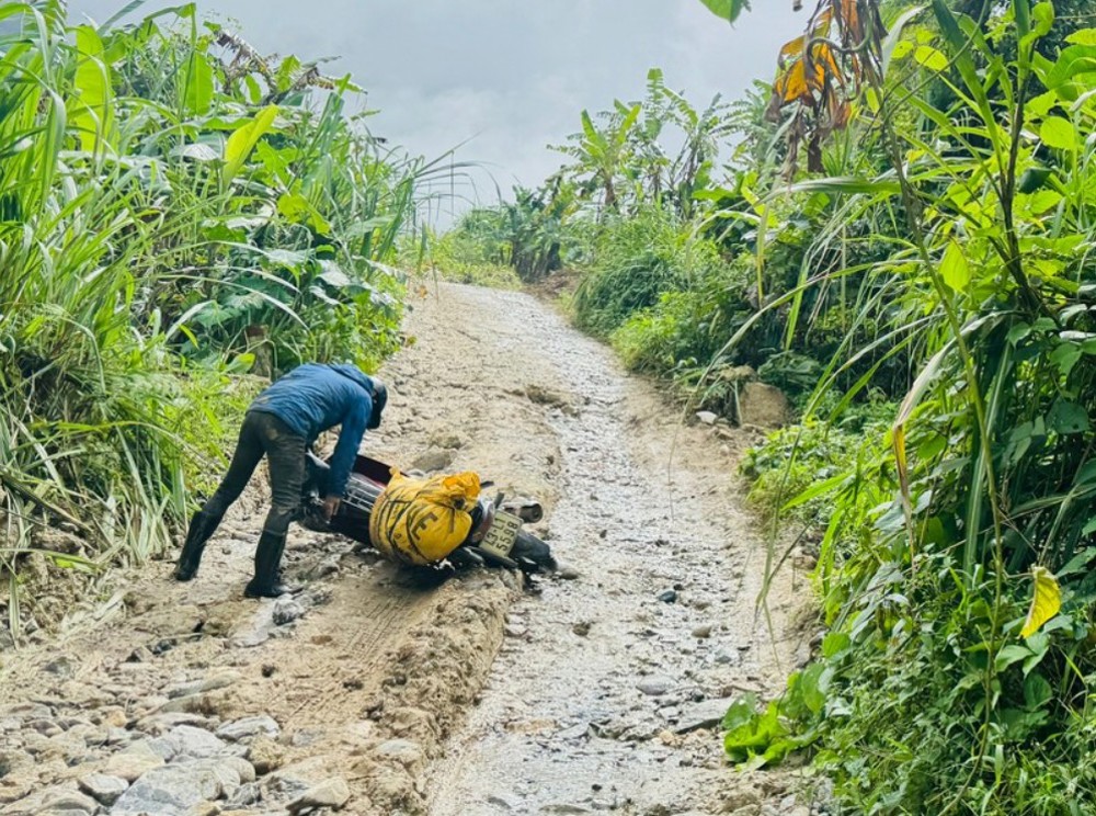 Được sự hỗ trợ tận tình của Sư cô An Hạ - Học viên Khoa Phật học từ xa, Khóa 5, cùng quý Phật tử chùa Thanh Lương, chúng tôi đã vượt hơn 170 km đường đèo núi, mất gần 6 tiếng đồng hồ để đến được điểm trao quà. Khi xe lớn không thể tiếp tục, chúng tôi phải chuyển sang xe máy của người địa phương. Những con đường núi gập ghềnh, đá lớn nhỏ lởm chởm, có đoạn sạt lở, có đoạn nước chảy xiết. Ngồi sau xe, ai nấy đều nín thở, thấu cảm sâu sắc sự gian nan trong cuộc sống hằng ngày của bà con nơi đây.