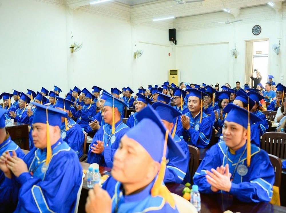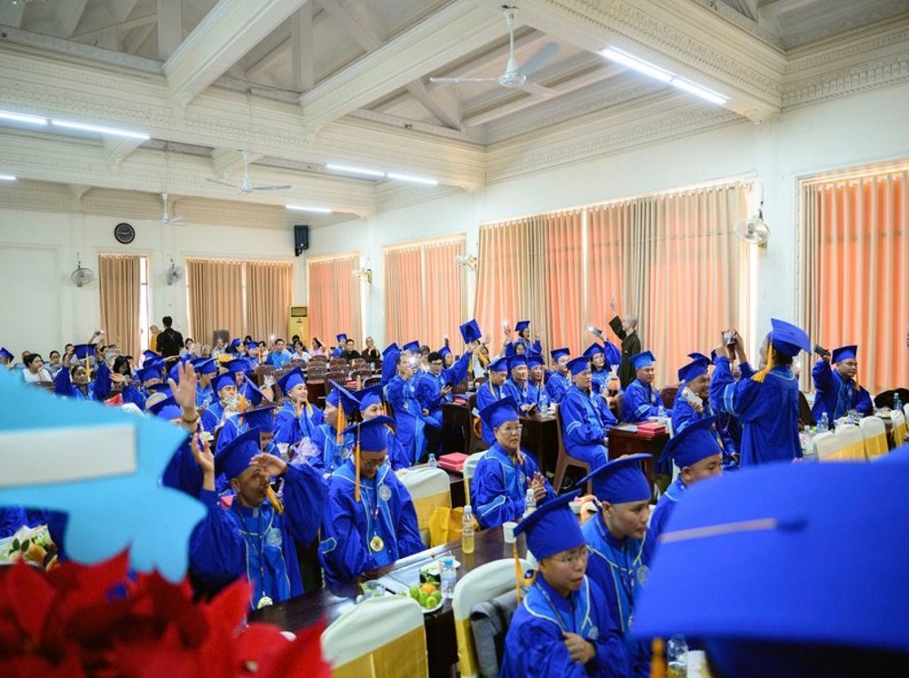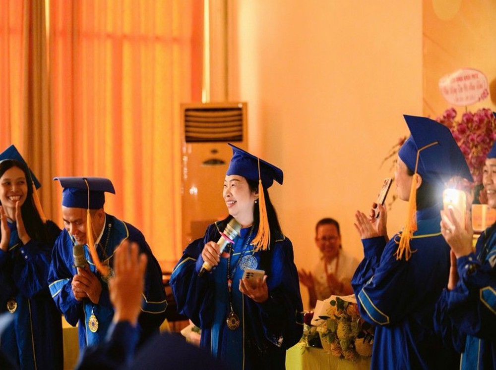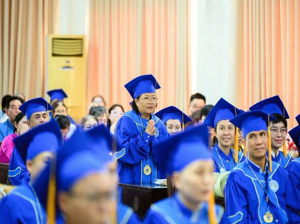 Ánh đèn trong phòng học không còn đơn thuần là ánh sáng điện, mà như đang hòa cùng ánh sáng của pháp lạc, của niềm vui tốt nghiệp, của những năm tháng chuyển hóa mà mỗi học viên đã đi qua.