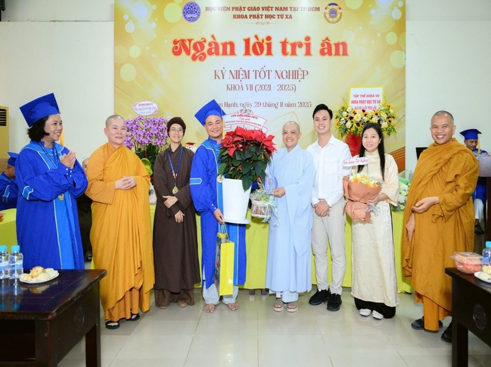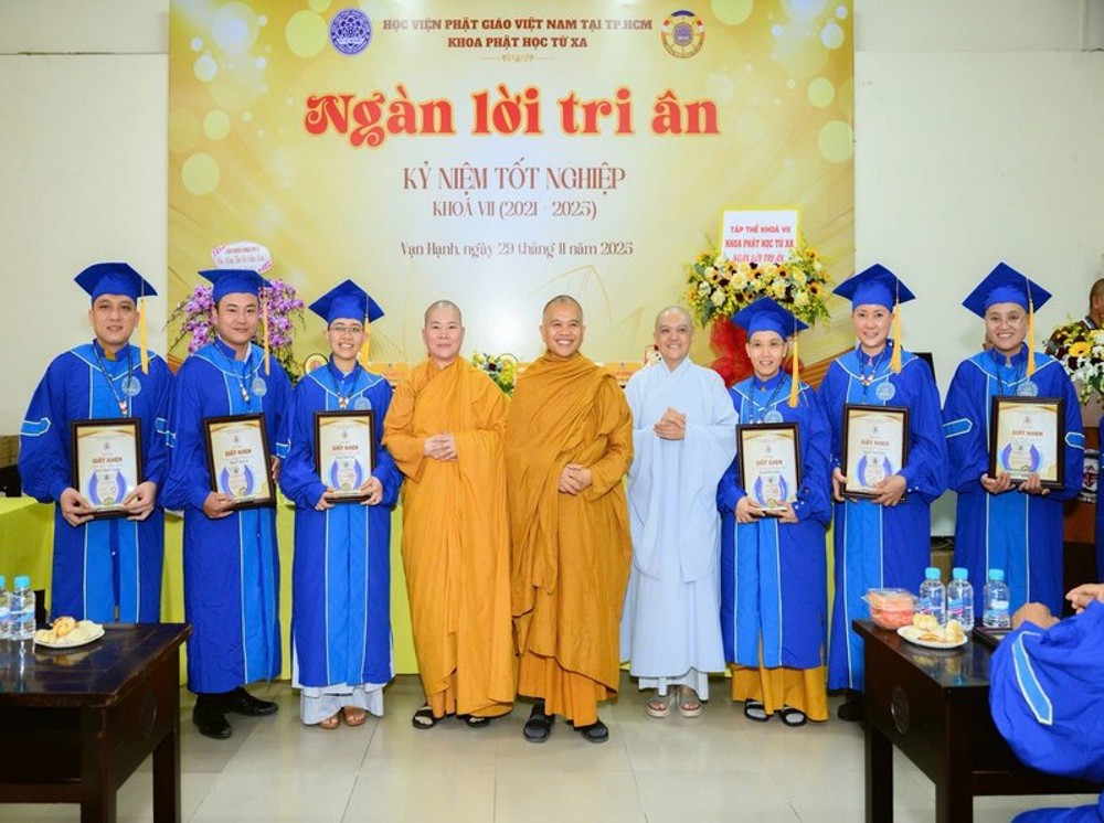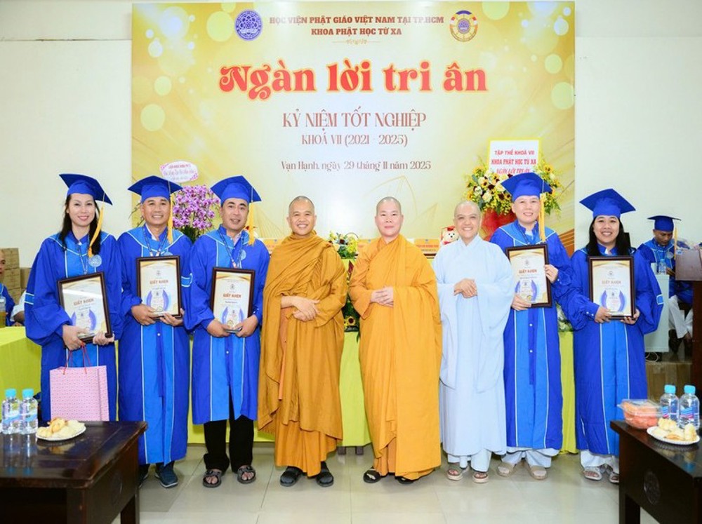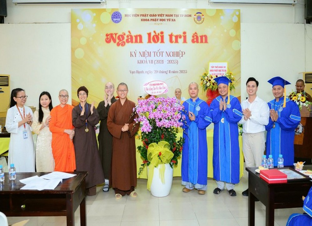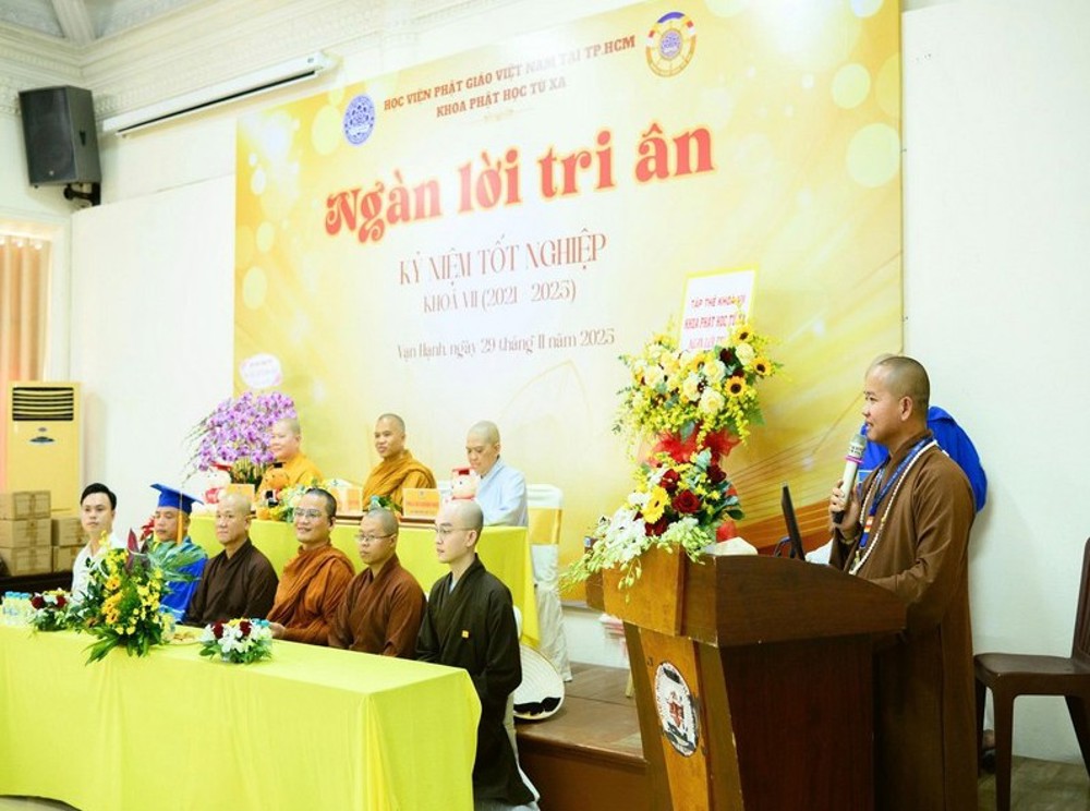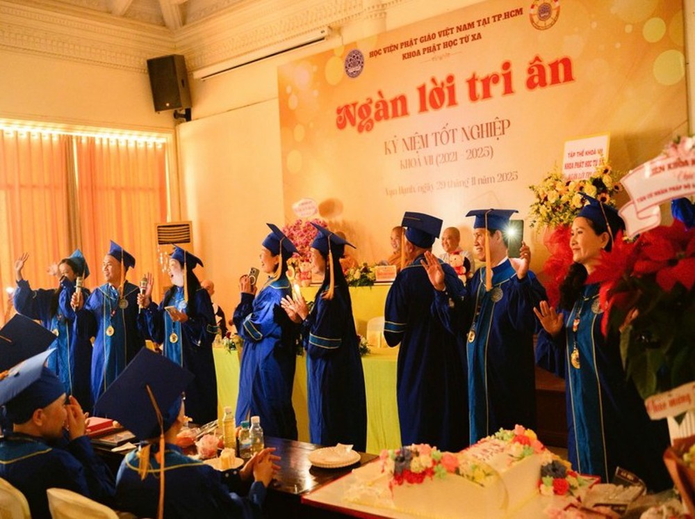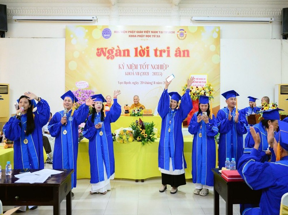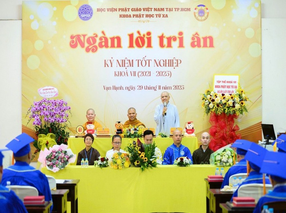 Chiều ngày 29/11/2025, tại giảng đường E thuộc Cơ sở 1 – Học viện Phật giáo Việt Nam, số 750 Nguyễn Kiệm, phường Đức Nhuận, TP. Hồ Chí Minh, nhân ngày lễ Tốt nghiệp niên khóa 2021-2025, chư Tôn đức Tăng Ni sinh và quý Cư sĩ học viên Khóa VII Khoa Phật học từ xa đã trang nghiêm tổ chức chương trình “Ngàn lời tri ân”.