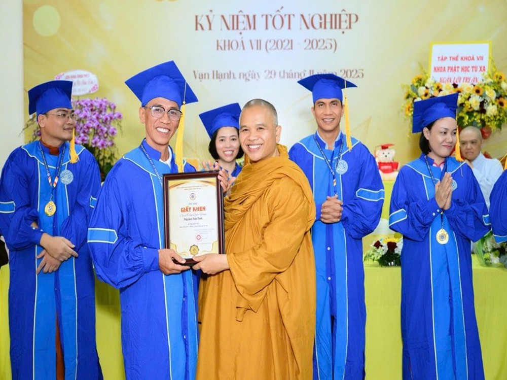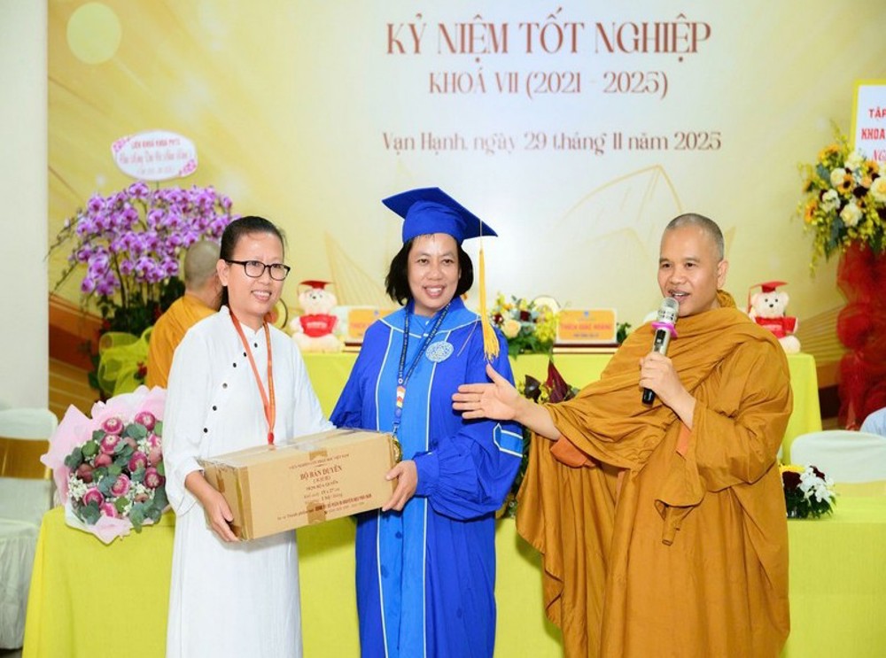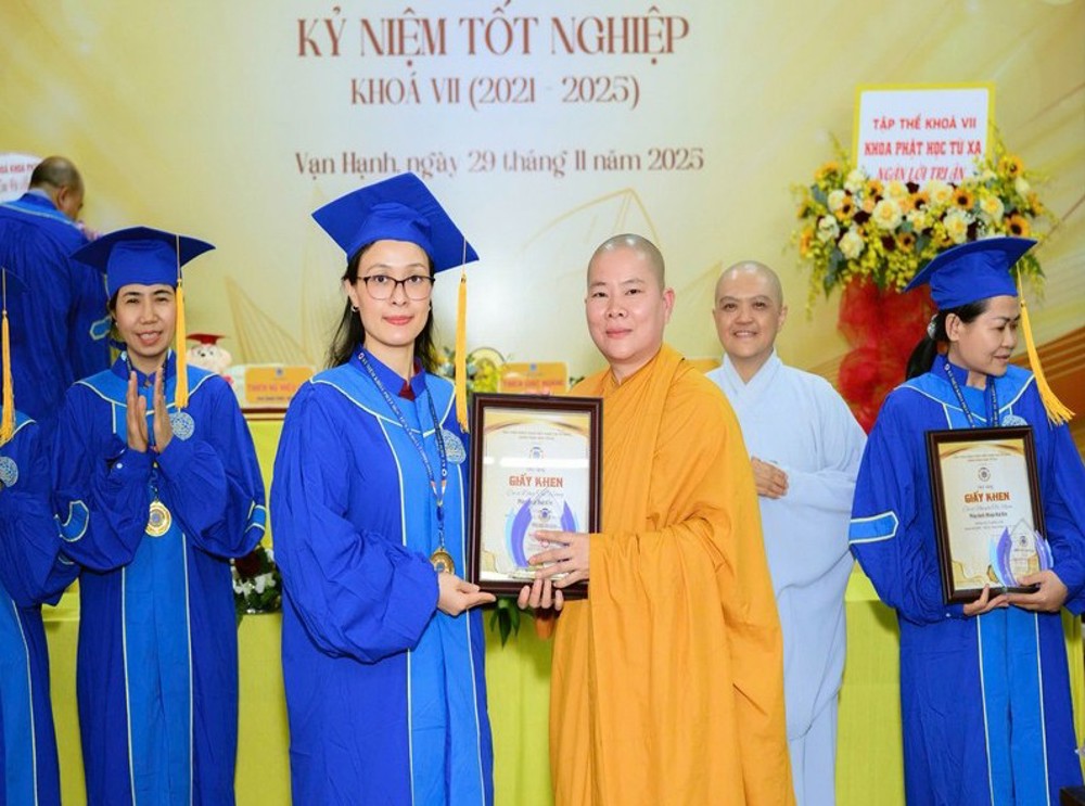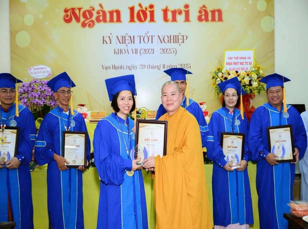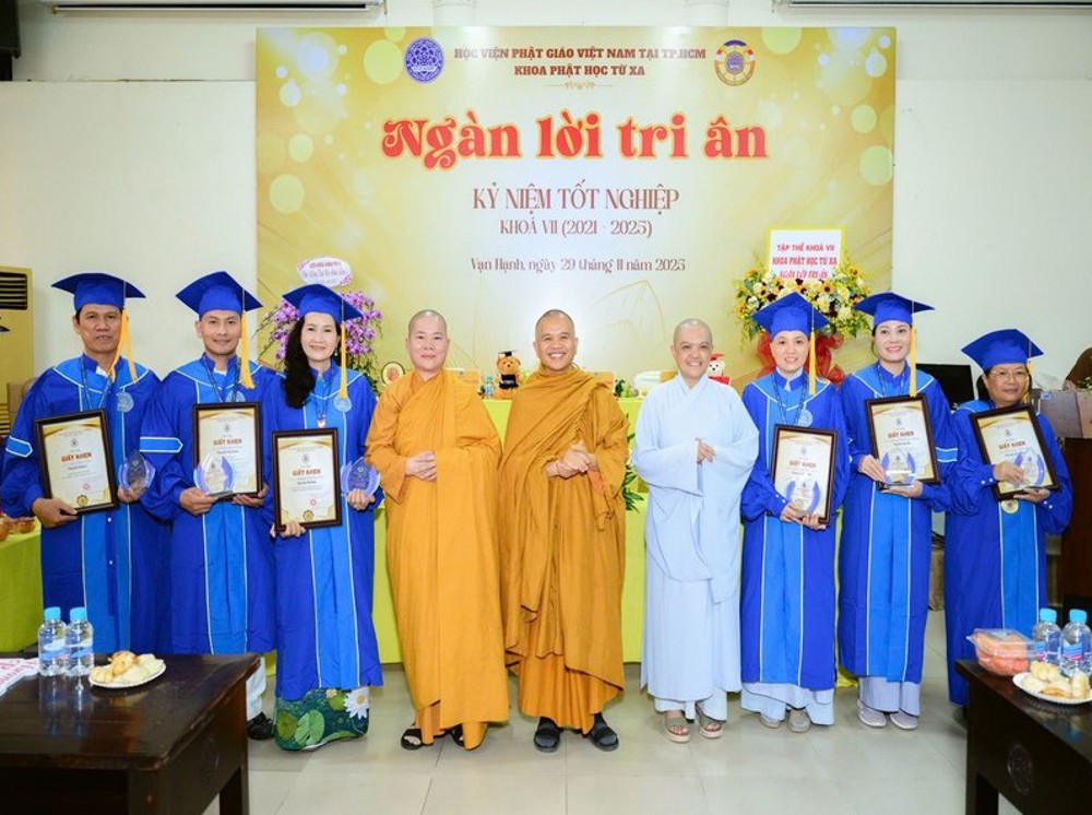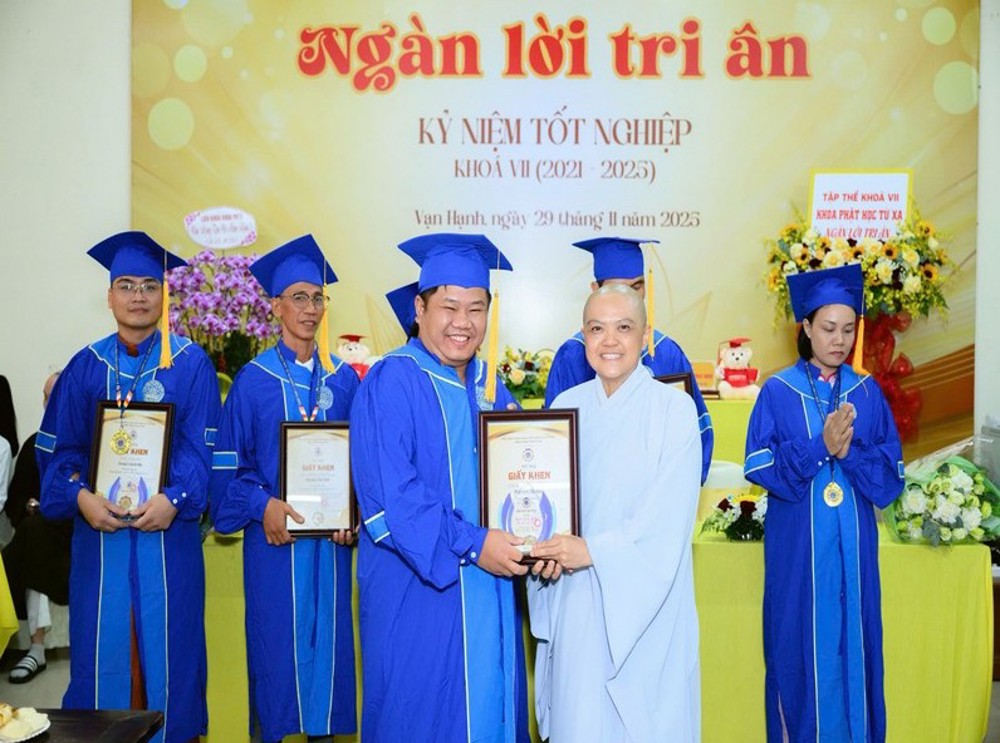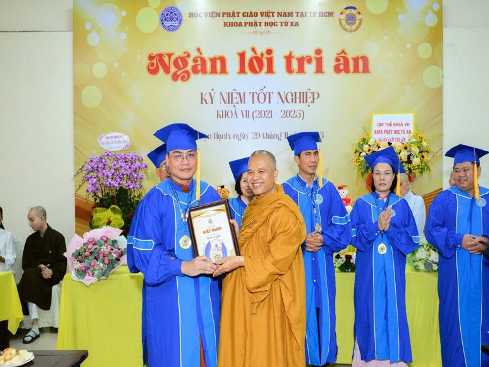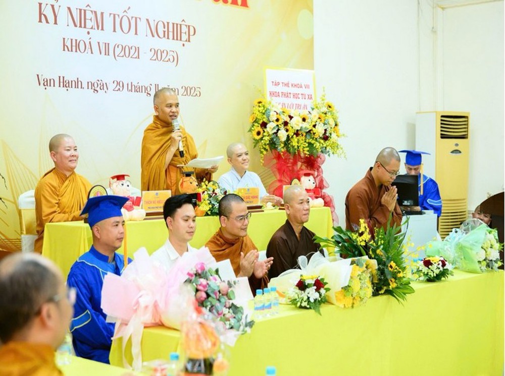 Chiều ngày 29/11/2025, tại giảng đường E thuộc Cơ sở 1 – Học viện Phật giáo Việt Nam, số 750 Nguyễn Kiệm, phường Đức Nhuận, TP. Hồ Chí Minh, nhân ngày lễ Tốt nghiệp niên khóa 2021-2025, chư Tôn đức Tăng Ni sinh và quý Cư sĩ học viên Khóa VII Khoa Phật học từ xa đã trang nghiêm tổ chức chương trình “Ngàn lời tri ân”.