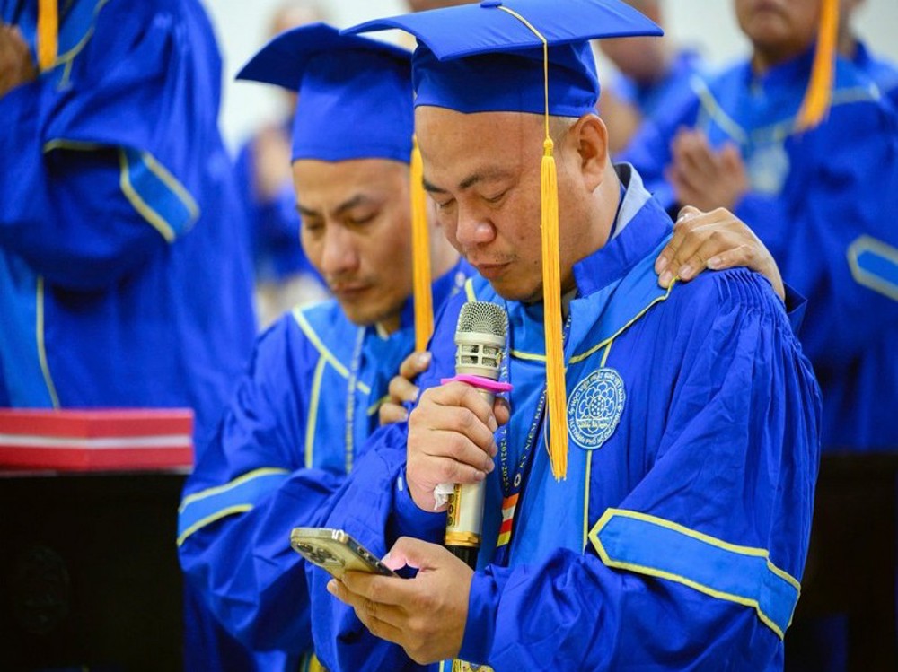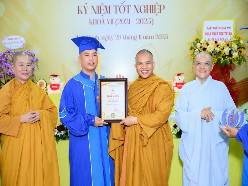 Khi tiếng pháo tay lắng xuống, Thầy lớp trưởng – Thích Thiện Đăng bước lên phía trước. Trên gương mặt hiền hòa của thầy, ai cũng thấy rõ một điều: niềm tự hào ấy không chỉ vì một tấm bằng, mà vì bốn năm trưởng thành của cả một tập thể. Có những người khi vào học chưa từng biết quan sát tâm, nay đã biết soi lại từng khởi niệm. Có những người trước đây chưa một lần phát tâm Bồ đề, nay đã phát khởi nguyện lớn. Có những người đến lớp với vô vàn muộn phiền, nay biết cách chuyển hóa và buông nhẹ như lời Phật dạy.
