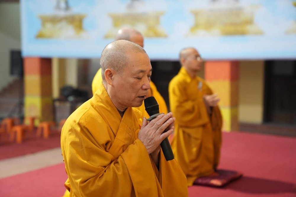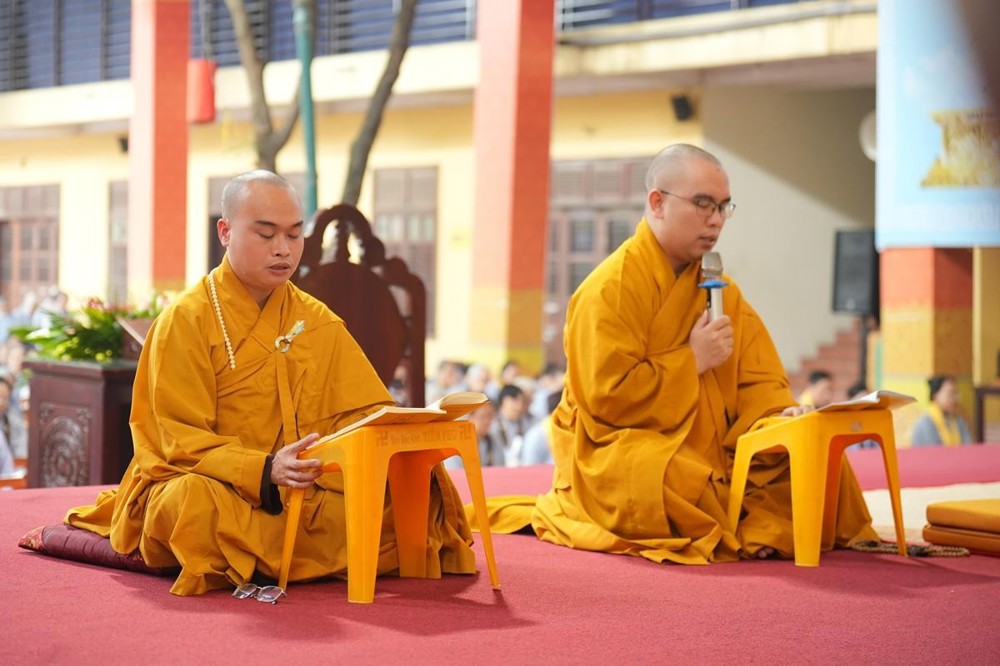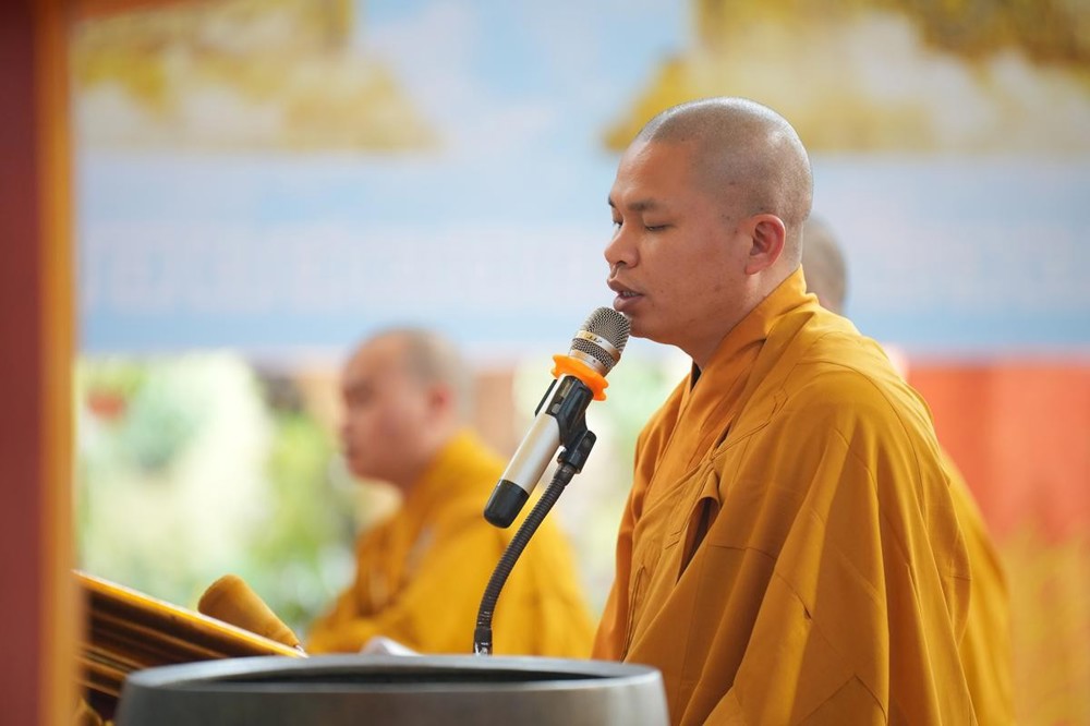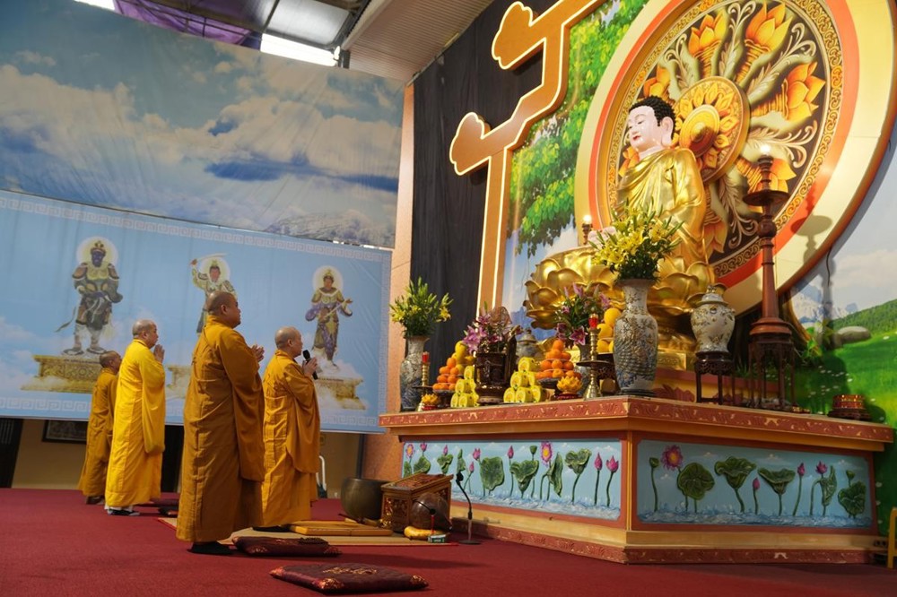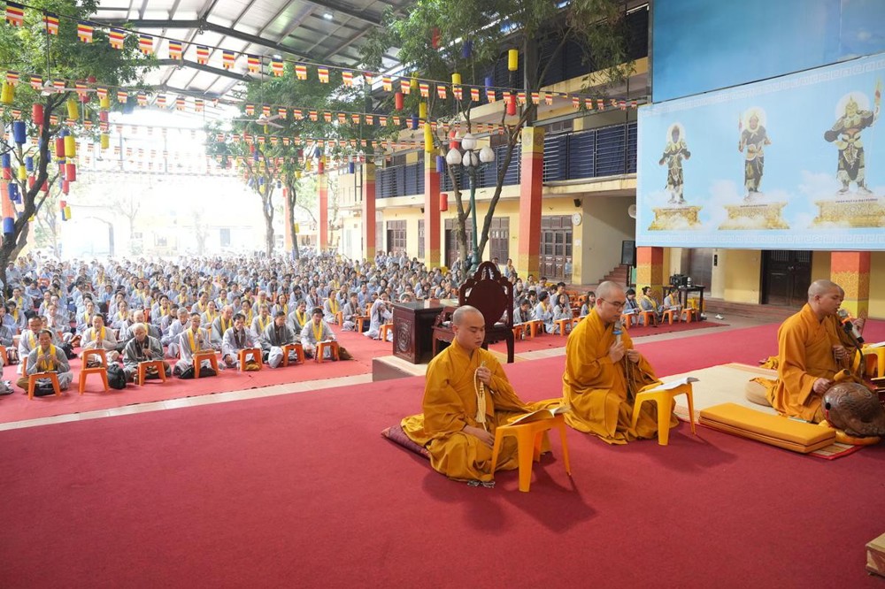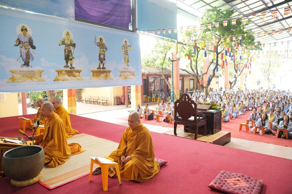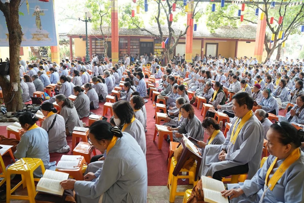 Sau thời pháp thoại ý nghĩa mà Hòa thượng truyền trao, đại chúng tiếp tục thành kính hướng về tôn tượng Đức Bản Sư, trì tụng Bổn Môn Pháp Hoa Kinh cầu nguyện Quốc thái dân an, Phật pháp hưng long.