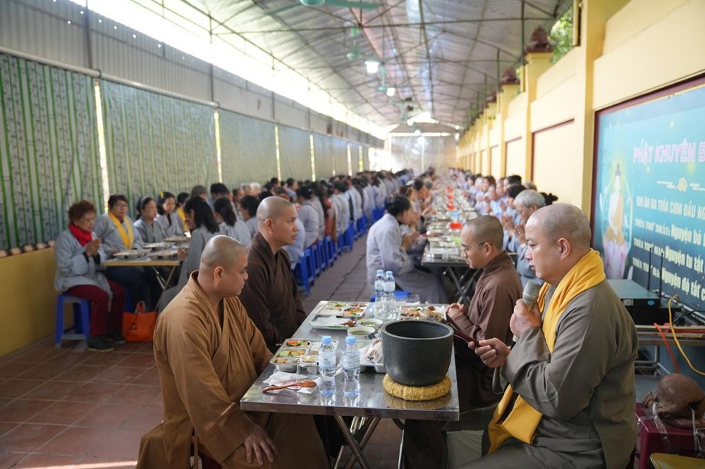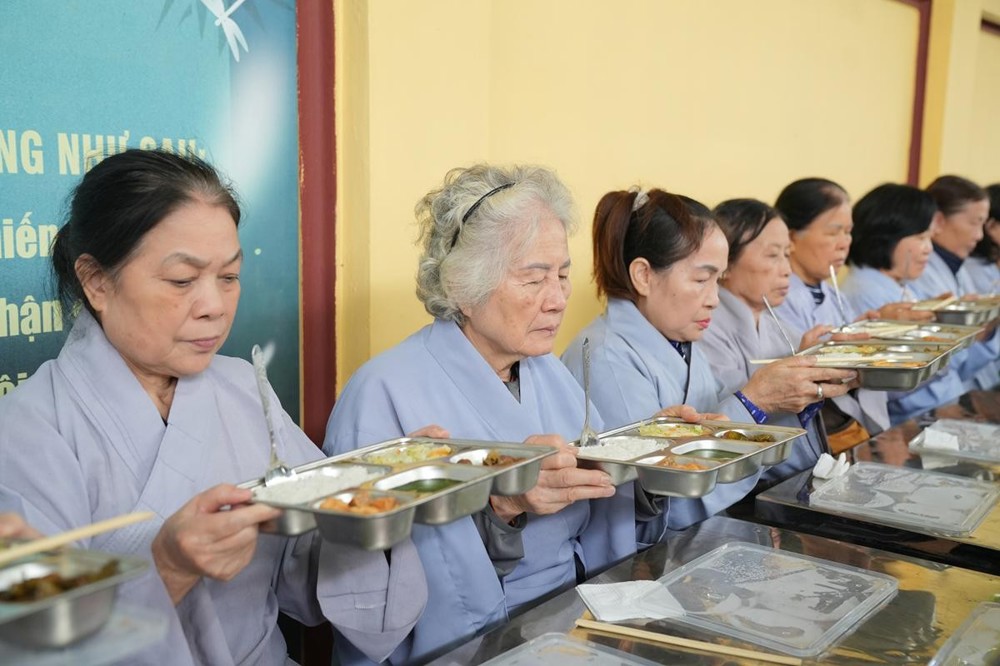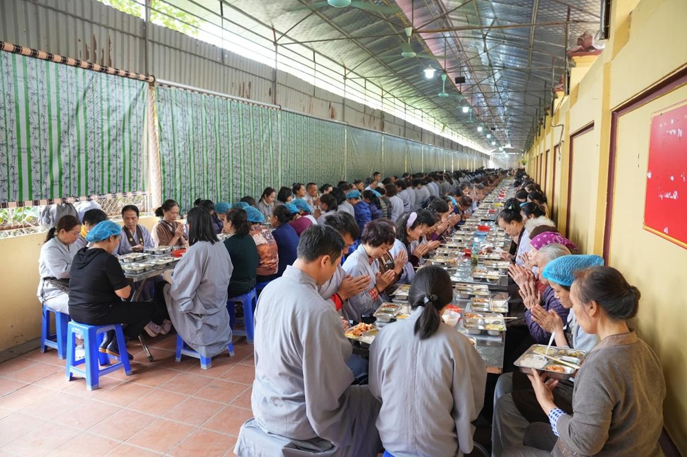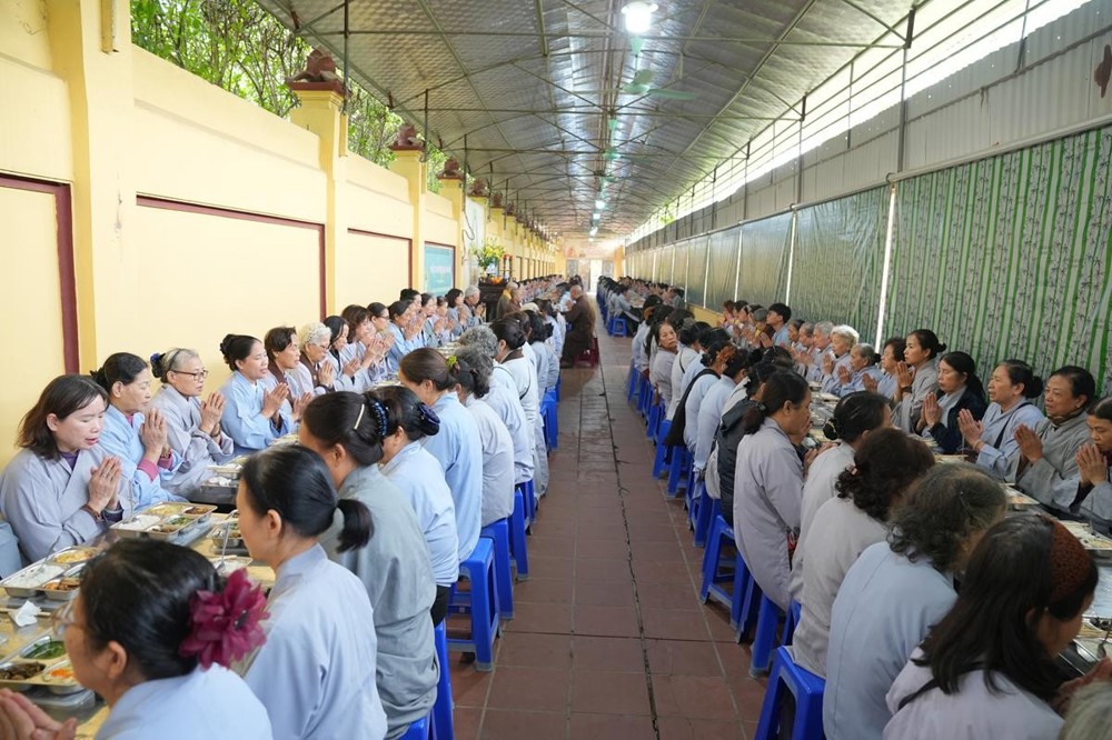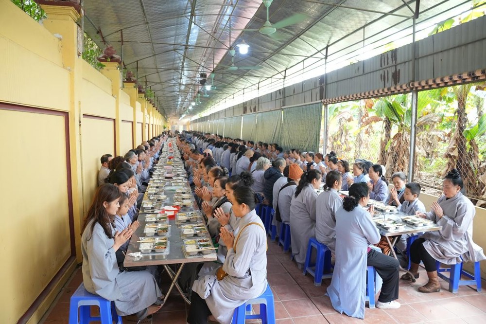 Đến buổi trưa, đại chúng trang nghiêm cử hành nghi thức cúng Quá Đường, thọ dụng cơm chay trong chính niệm, quán tưởng công ơn thí chủ và nuôi lớn tâm từ trong sự an lạc.