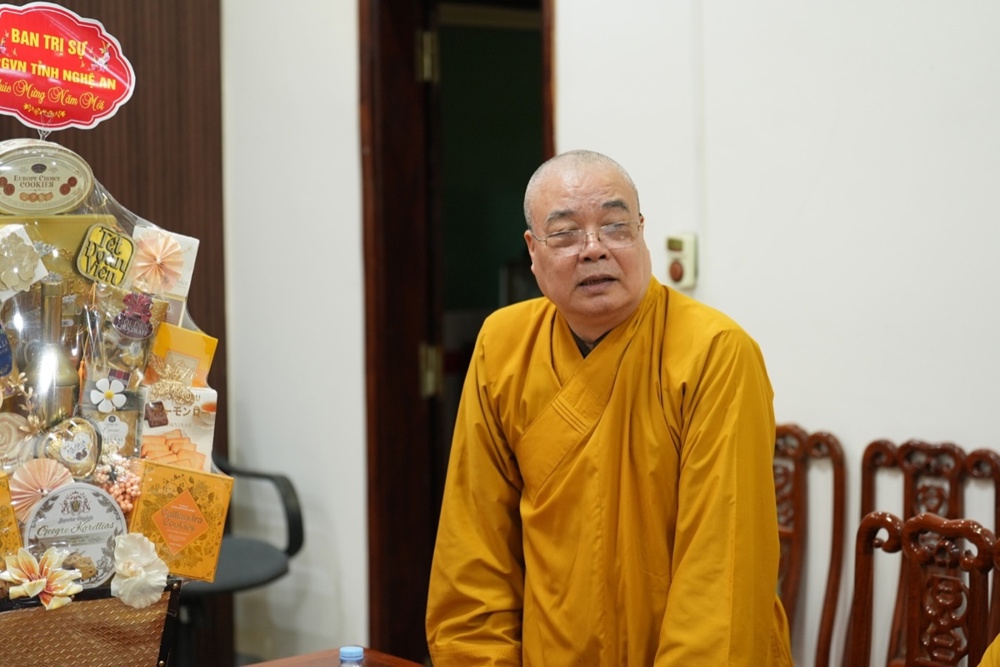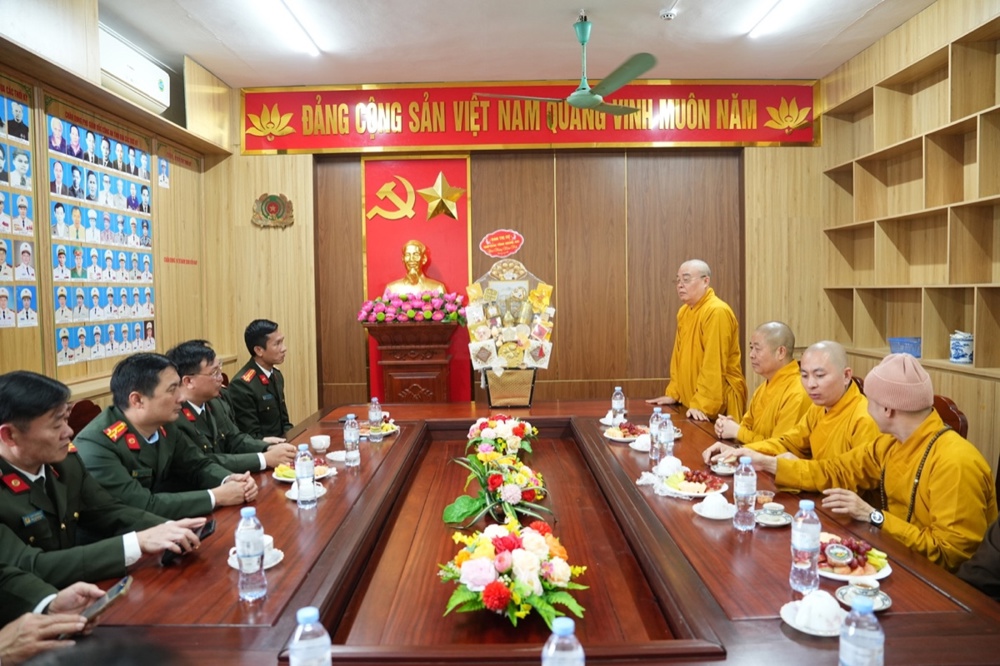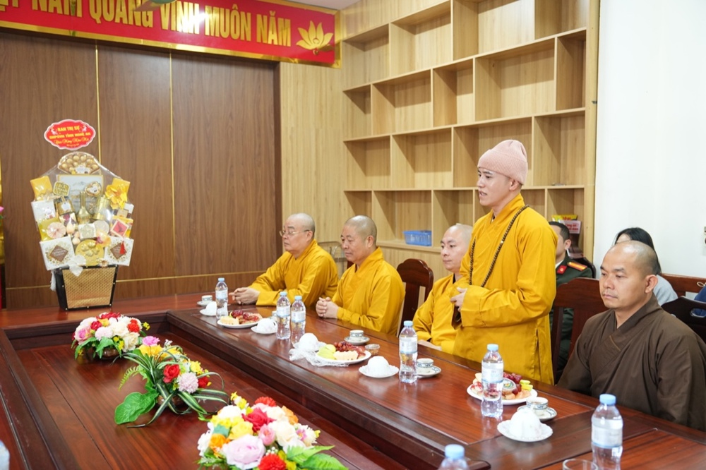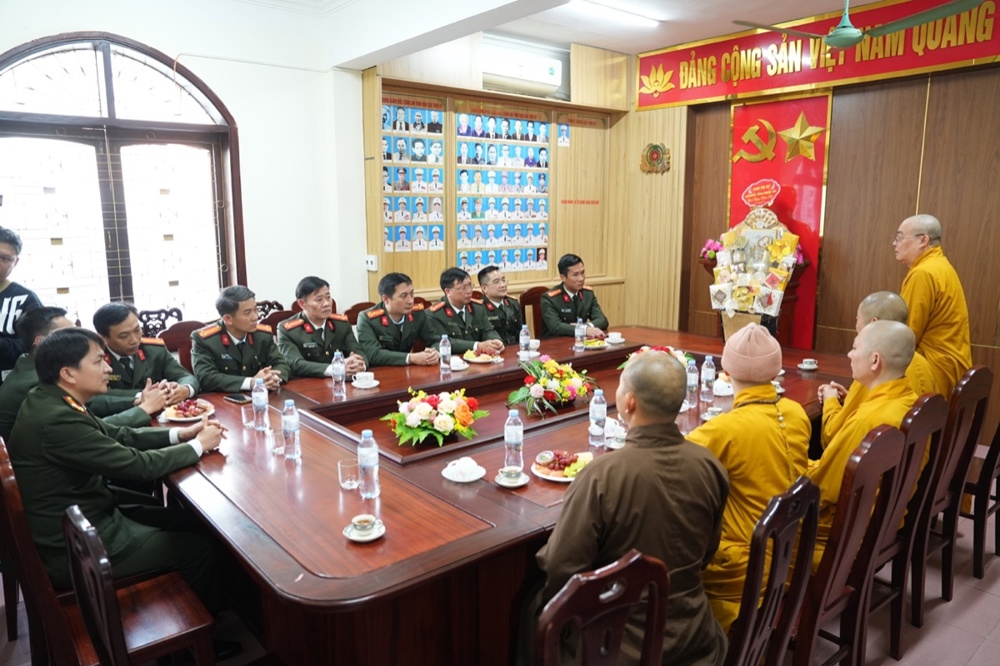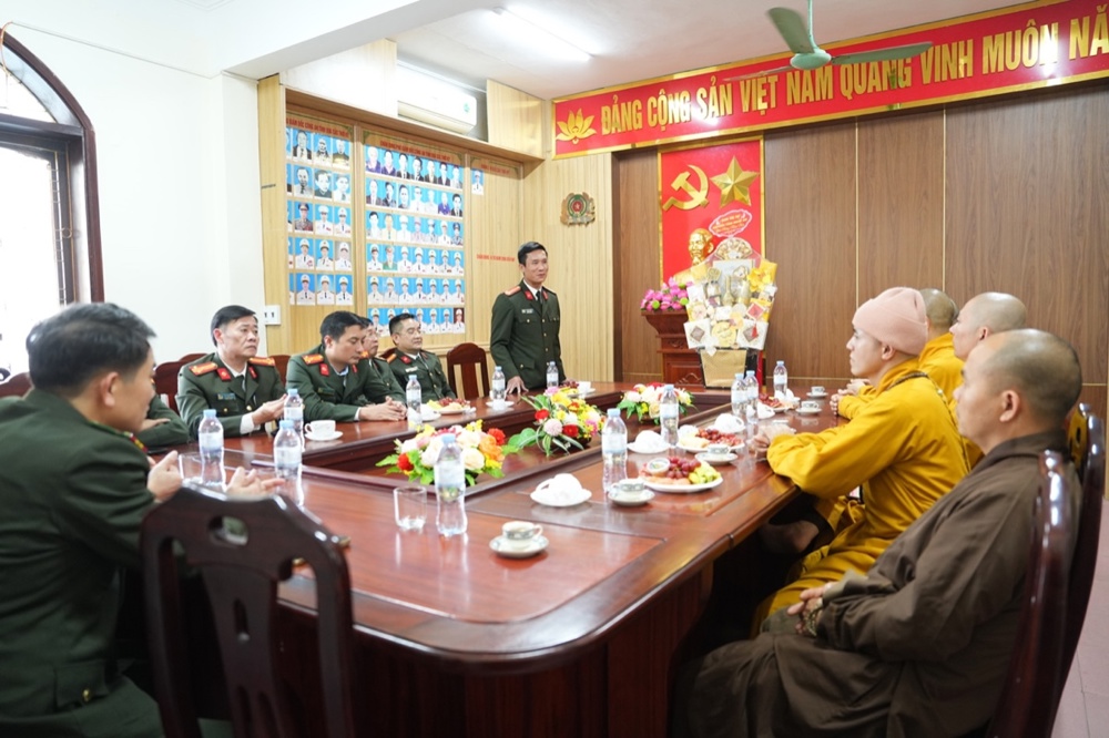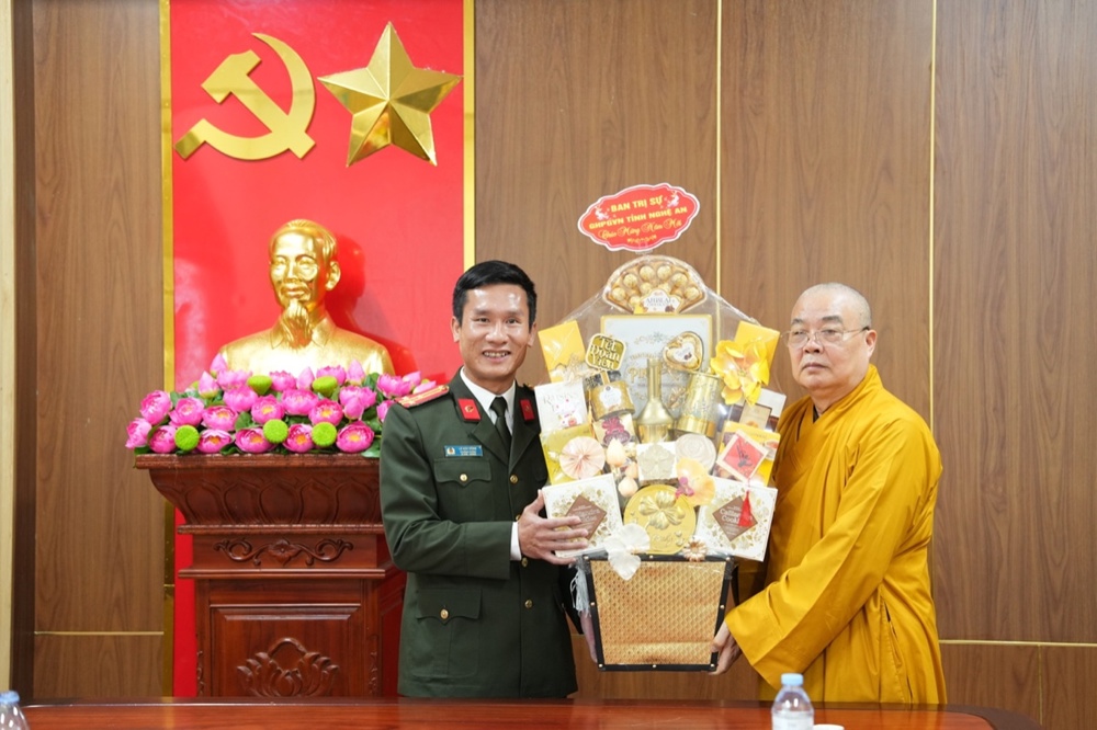 Trong không khí thân mật, Thượng tá Lê Đức Dũng - Trưởng Phòng An ninh nội địa, Công an tỉnh Nghệ An gửi lời chúc Xuân an lạc đến phái đoàn. Sự quan tâm của Phật giáo là nguồn động viên lớn với các cán bộ chiến sĩ công an để tiếp tục cống hiến vì sự nghiệp an ninh Tổ quốc. Trong nhiều năm qua, hai bên đã phối hợp chặt chẽ để xây dựng, phát triển GHPGVN tỉnh; và chư Tăng Ni, Phật tử trên địa bàn tỉnh đã đóng góp không nhỏ giữ gìn sự yên bình của địa phương. Thượng tá mong muốn Phòng An ninh nội địa và GHPGVN tỉnh tiếp tục phối hợp, chăm lo an sinh xã hội, an ninh trật tự cho nhân dân xứ Nghệ.
