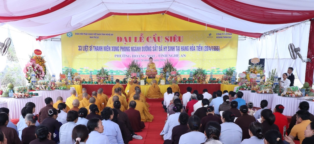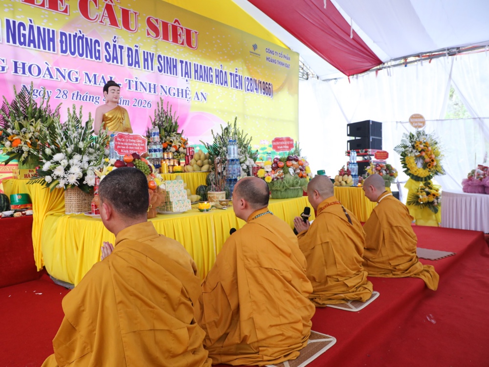 PSO: Nằm trong khuôn khổ chương trình lễ kỷ niệm 60 năm ngày hy sinh của các liệt sỹ TNXP tại Hang Hỏa Tiễn (28/4/1966 – 28/4/2026). Tại Khu di tích Hang Hỏa Tiễn và Nghĩa trang liệt sỹ đường sắt (khối Tân Hùng, phường Hoàng Mai, tỉnh Nghệ An), Ban Trị sự GHPGVN tỉnh Nghệ An phối hợp cùng Sở Văn hóa, Thể thao và Du lịch tỉnh Nghệ An trang nghiêm tổ chức lễ cầu siêu tri ân các liệt sỹ Thanh niên xung phong đã anh dũng hy sinh.