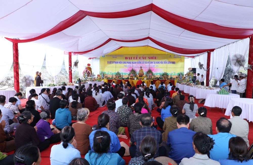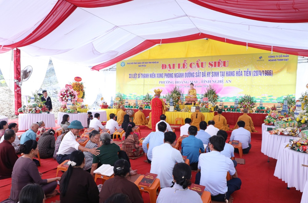 Trong không khí thành kính, chư Tăng cùng đại biểu và quý Phật tử nhất tâm tụng kinh cầu siêu, dâng hương tưởng niệm, nguyện đem công đức hồi hướng đến anh linh 33 liệt sỹ, cầu nguyện chư vị được siêu sinh tịnh cảnh, an nhiên nơi cõi lành.